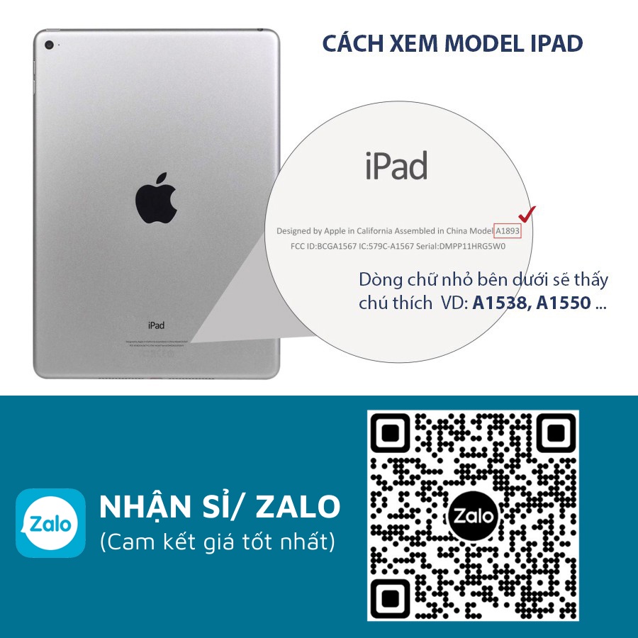 Bước 1: Lật mặt sau của ipad, ở vỏ iPad sẽ thấy chú thích VD:A1538,A1550 ... (Shop để ảnh hướng dẫn trên Album ảnh)