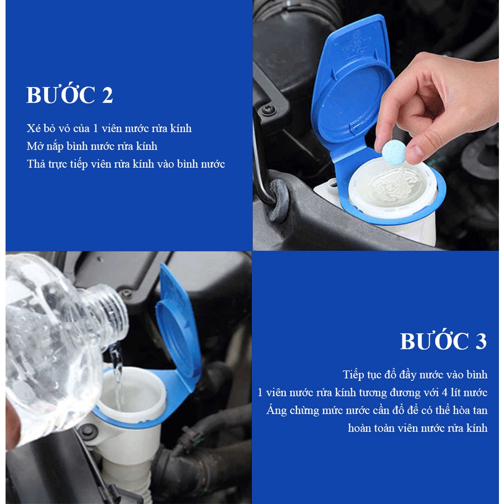 mỗi viên hòa từ 3-4l nước. Thả 1 viên nén vào 4 lít nước chờ hoà tan rồi đổ vào bình nước rửa kính của xe hoặc có thể thả trực tiếp viên nén vào bình nước rửa kính.