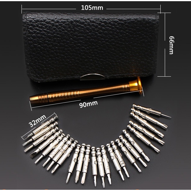 Bộ tô vít ví da 25 trong 1 với sự tiện lợi của nó chắc chắn hỗ trợ cho bạn rất nhiều trong công việc sửa chữa đặc biệt cac đồ linh kiện điện tử được thiết kế nhỏ như đồng hồ, điện thoại, máy ảnh...v.v. Các đầu tua vít được gia công bằng loại thép hóa có độ bền cao, chống gỉ sét. Có thể dùng để mở các loại vít: đầu dẹt, tam giác, lục giác, 3 cạnh, 4 cạnh, 5 cạnh và 6 cạnh, mỗi dạng đều có đủ các cỡ từ lớn đến nhỏ có thể thay đổi dễ dàng.Thông số kỹ thuật: