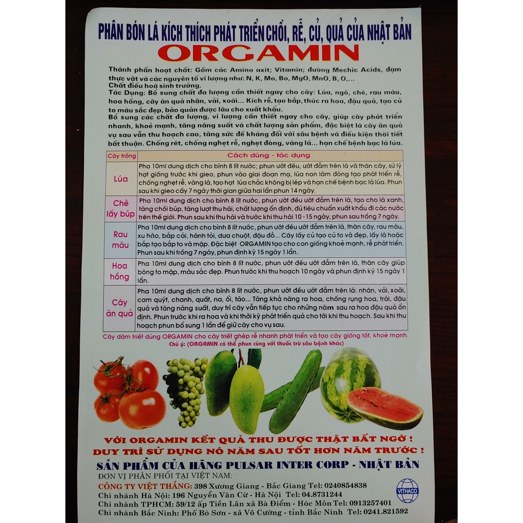 Giới thiệu [VITHACO] Phân bón lá hữu cơ Nhật Bản Orgamin kích thích sinh trưởng cho hoa cảnh, rau màu, cây ăn trái [gói 20ml]