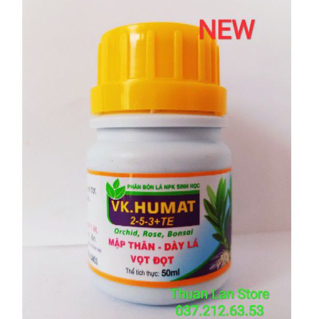 Phân bón lá VK. HUMAT 2-5-3 + TE chai 50ml giúp cây trồng Mập thân, dày lá, Vọt đọt. Chống nứt thân, vàng lá.Qui cách sản phẩm: Chai 50ml