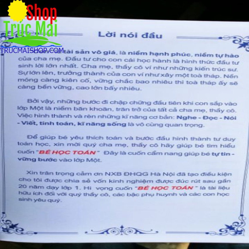 YỄN THỊ NĂNG HI VLỚP 1 VÀ HỌ QUYẾN HEO MỌI v3 4 Lời nói đầu “ Con ” là tài sản vô giá , là niềm hạnh phúc , niềm tự hào của cha mẹ . Đầu tư cho con cái học hành là hình thức đầu tư sinh lời lớn nhất . Cha mẹ , thầy cô ví như những kiến trúc sư . sự lớn lên , trưởng thành của con ví như xây một toà tháp . Nền móng càng kiên cố , vững chắc bao nhiêu thì toà tháp ấy sẽ càng bền vững , cao lớn bấy nhiêu . Bởi vậy , những bước đi chập chững đầu tiên khi con sắp vào lớp Một là niềm băn khoăn , trăn trở của tất cả cha mẹ , thầy cô . Việc hình thành và rèn những kĩ năng cơ bản : Nghe - Đọc - Nói - Viết tính toán , kĩ năng sống là vô cùng quan trọng . Để giúp bé yêu thích toán và bước đầu hình thành tư duy toán học , xin mời quý cha mẹ , thầy cô hãy giúp bé tìm hiểu cuốn “ BÉ HỌC TOÁN " Đây là cuốn cẩm nang giúp bé tự tin - vững bước vào lớp Một . Xin trân trọng cảm ơn NXB ĐHQG Hà Nội đã tạo điều kiện cho tôi được chia sẻ vốn kinh nghiệm được đúc rút sau gần 20 năm dạy lớp 1 . Hi vọng cuốn “ BÉ HỌC TOÁN " là tài liệu hữu ích đối với quý thầy cô , các bậc phụ huynh và các con học sinh yêu quý . – ô A2 , -Giá BNBSNAKE