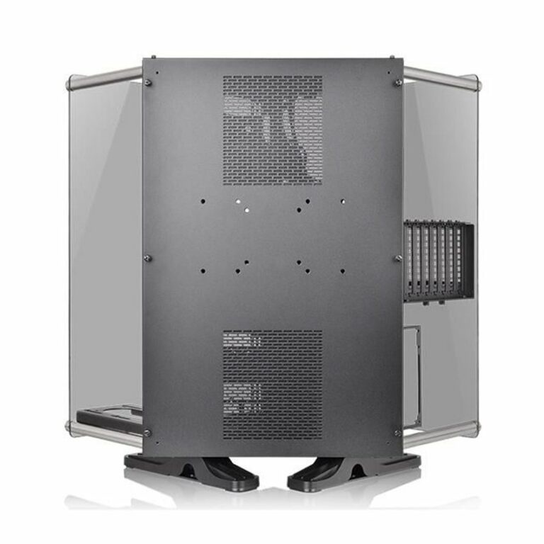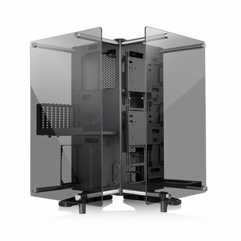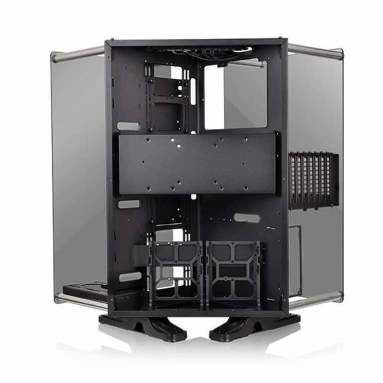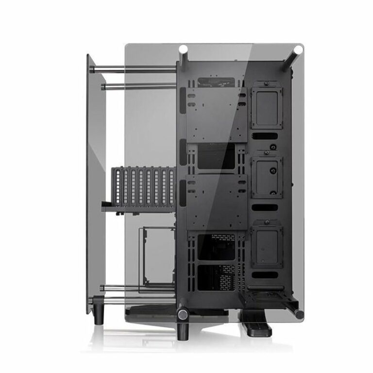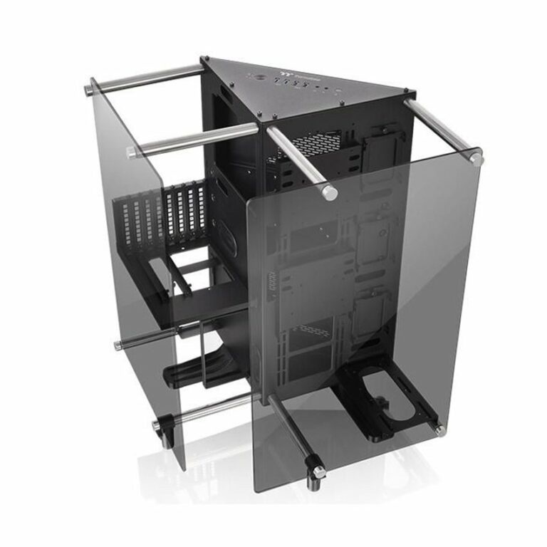 Thermaltake Core P90 Tempered Glass Edition Mid-Tower ChassisThermaltake đã mở rộng loại case Open Frame lên 1 tầm cao mới với Core P90. Core P90 TG tự hào sở hữu cấu trúc vỏ được chia thành ba ngăn cho card đồ họa, PSU và các thành phần làm mát khác. Thân hình lăng trụ hình tam giác và hai mặt kính cường lực dày 5mm, cho phép hiển thị hệ thống tối ưu từ mọi góc độ. Cùng với cách bố trí 3 chiều của nó (có thể lắp đặt trên tường, nằm ngang và đứng), 7 khoang ổ đĩa với thiết kế khay ổ đĩa mô-đun và khả năng mở rộng hệ thống làm mát chất lỏng cao