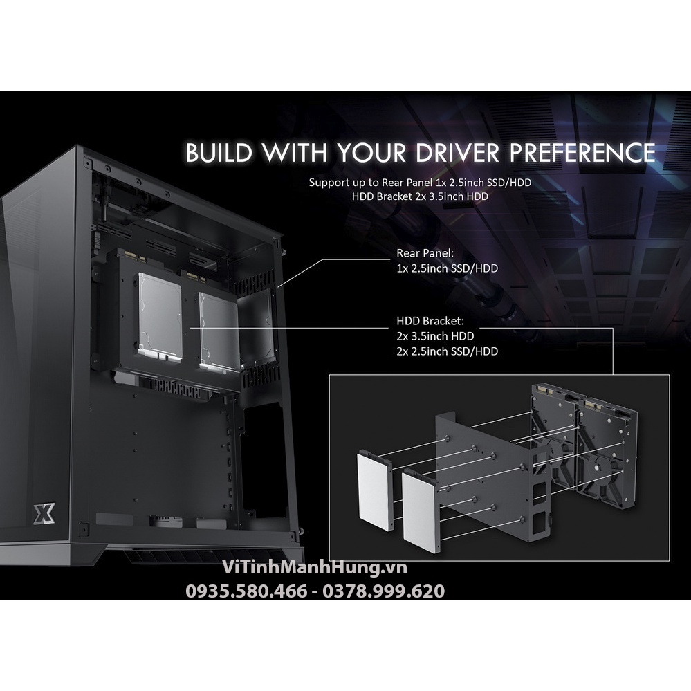 - Hỗ trợ gắn tản nhiệt nước 240/280mm trên nóc hoặc dưới đáy, 120mm phía sau.