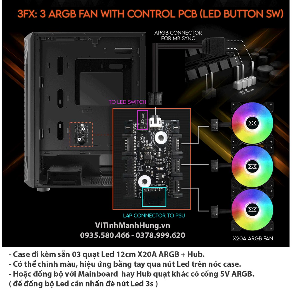 - Case đi kèm sẵn 03 quạt Led 12cm X20A ARGB + Hub.