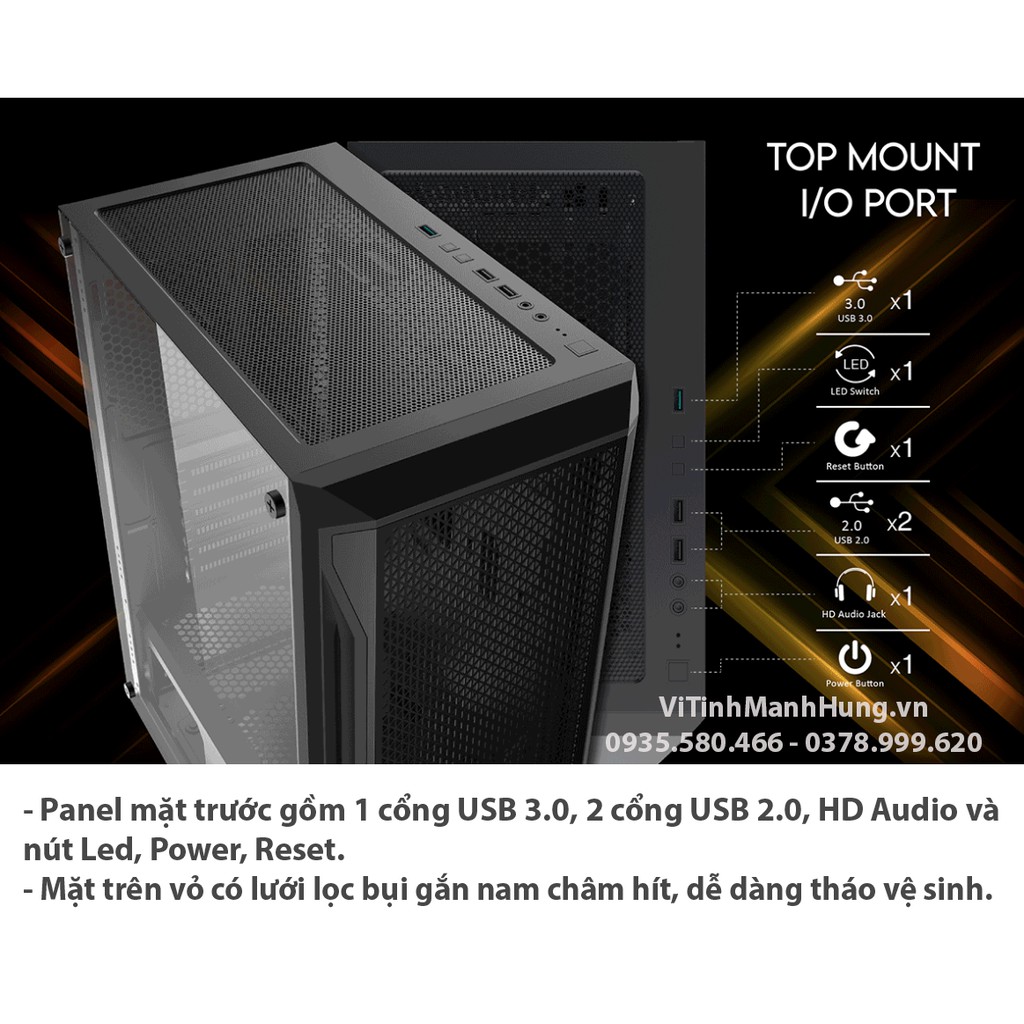 - Mặt trước case dạng lưới nhựa, mặt nạ phía trước có thể tháo rời để thay quạt hoặc vệ sinh riêng.