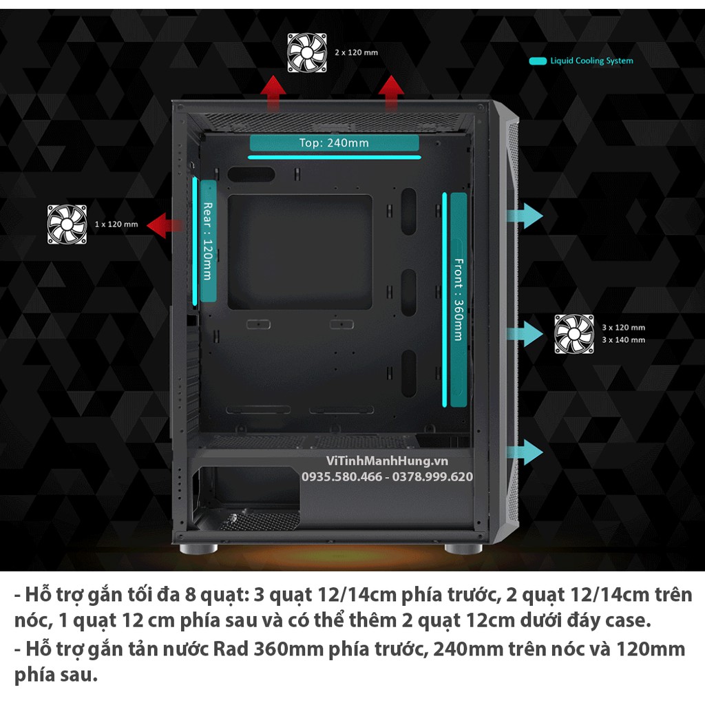 - Hỗ trợ gắn tản nước Rad 360mm phía trước, 240mm trên nóc và 120mm phía sau.