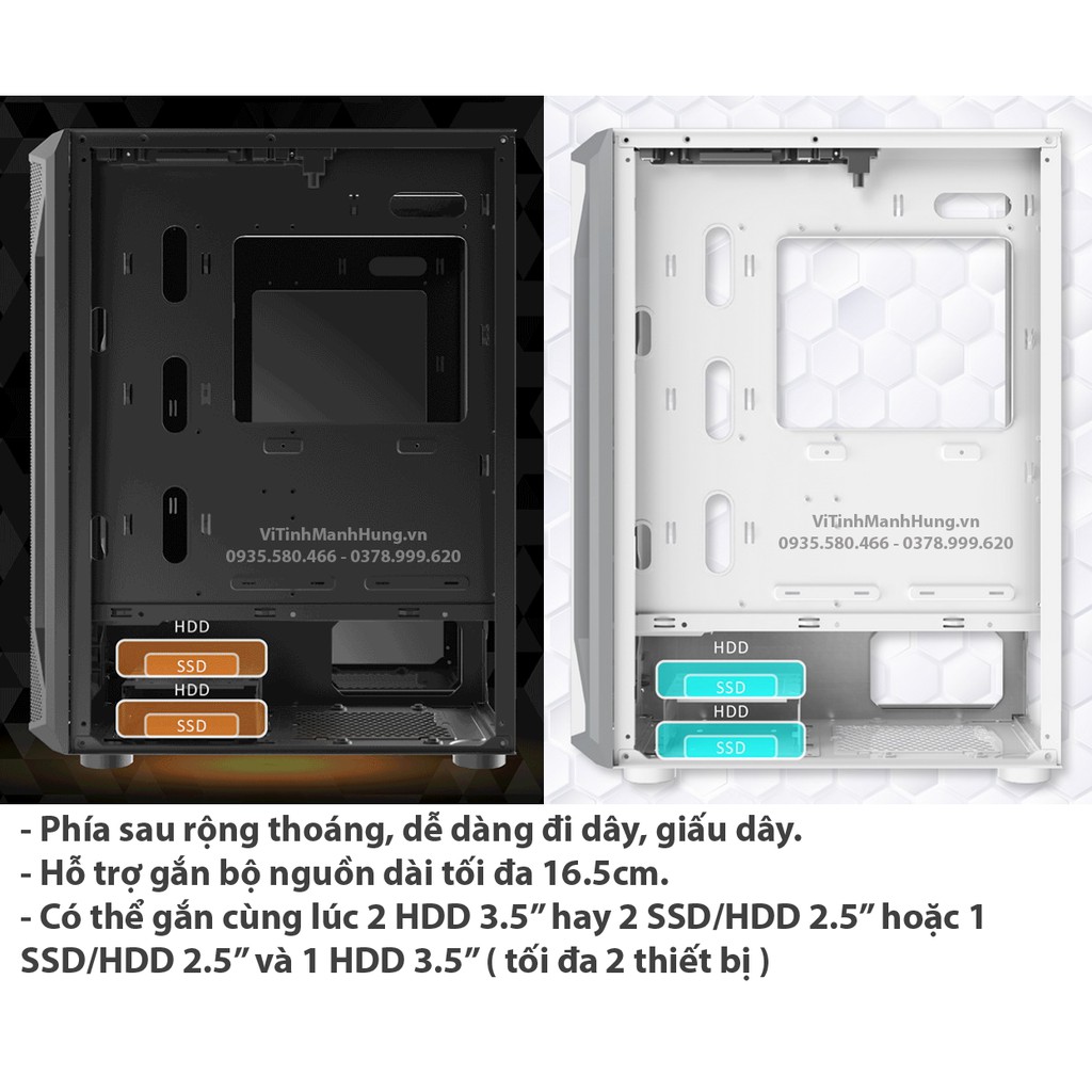 - Có thể gắn cùng lúc 2 HDD 3.5” hay 2 SSD/HDD 2.5” hoặc 1 SSD/HDD 2.5” và 1 HDD 3.5” ( tối đa 2 thiết bị )