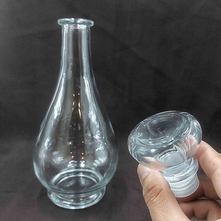 Dung tích: 950mlChai đựng rượu thủy tinh được thiết kế kiểu dáng rất sang trọng, như bình rươu bầu, đầu nắp thủy tinh hình tròn bầu họa tiết kim cương lập thể, thân bình bầu tròn không hoa văn kiểu dáng sang trọng, thủy tinh trong suốt.