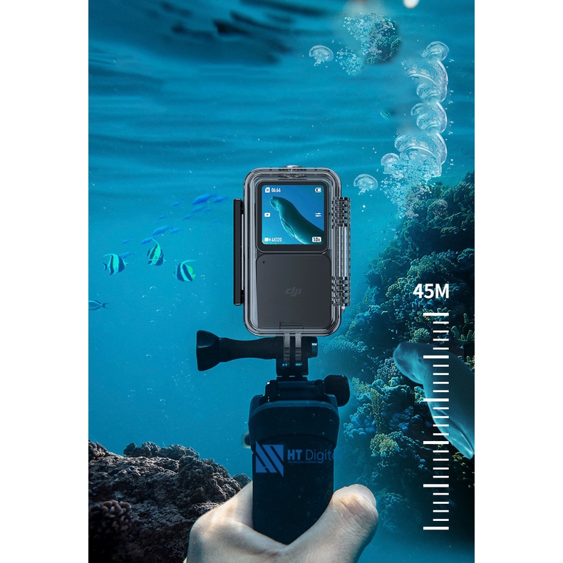 Phụ kiện vỏ chống nước của DJI Action 2 có thể chứa bộ phận Camera cùng với Mô-đun màn hình cảm ứng phía trước hoặc Mô-đun nguồn ở độ sâu lên đến 45m. Hỗ trợ hiển thị rõ ràng màn hình chiếc camera hành động DJI Action 2 của bạn ngay ở dưới nước.Lưu ý: