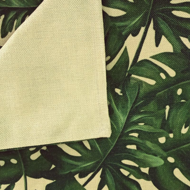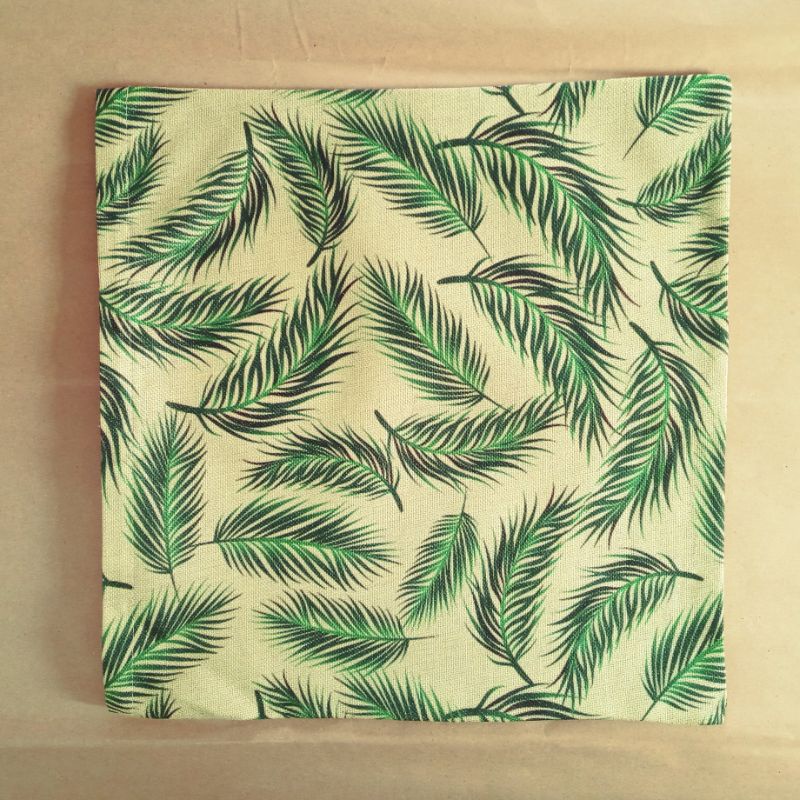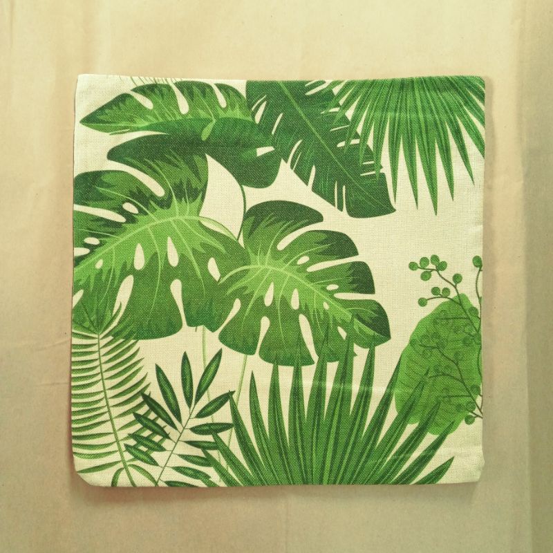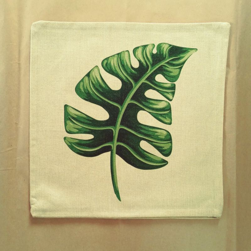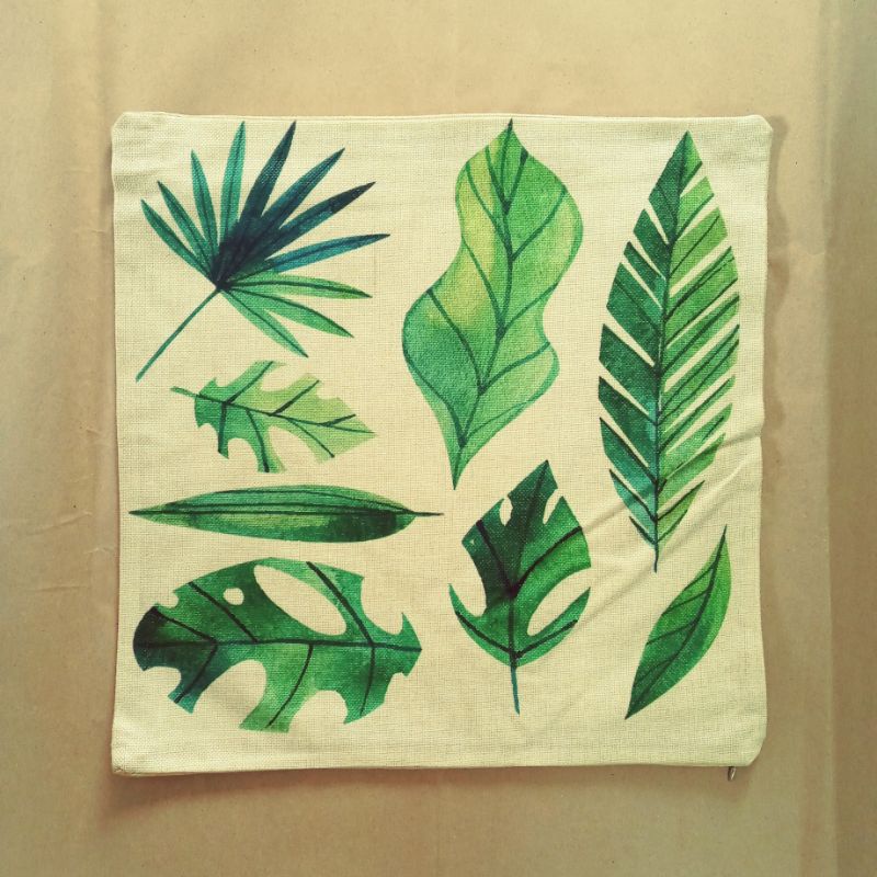 Vỏ gối tựa mẫu lá cây. Vỏ có khóa kéo dễ tháo giặt bằng máy giặt. Hình được in 1 mặt, mặt còn lại màu trắng ngà trơn.Chất liệu: vải gai.