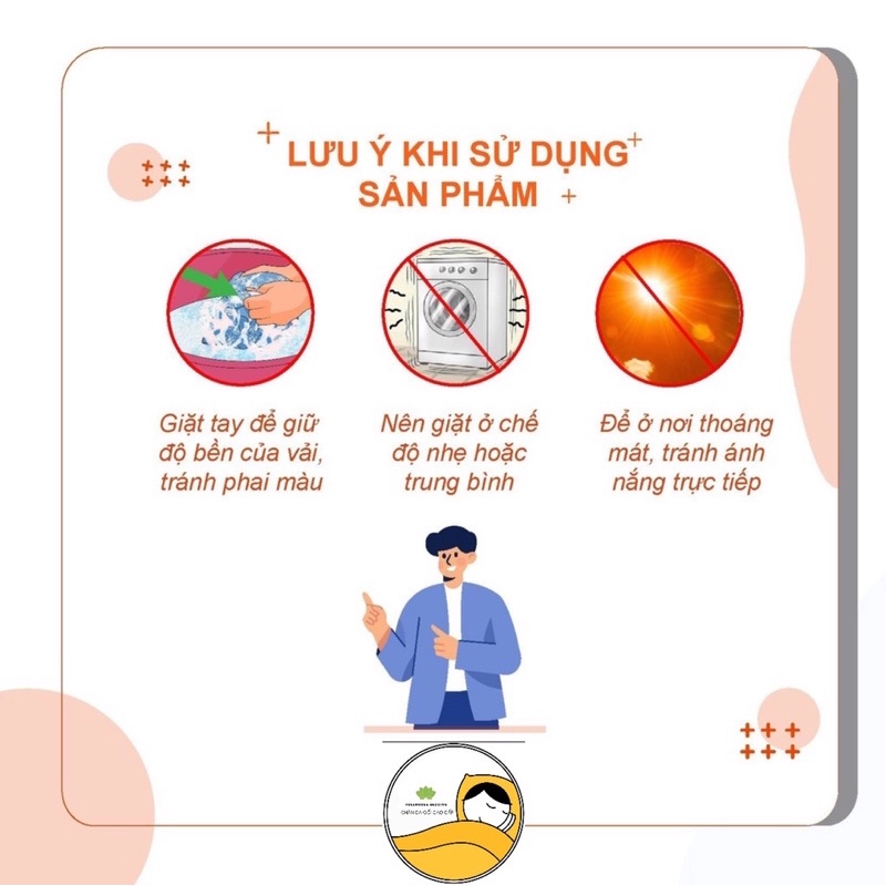 - Để sản phẩm được bền màu, ngay từ lần giặt đầu tiên, chỉ nên giặt 5 phút bằng nước lạnh (tuyệt đối không được ngâm sản phẩm với bột giặt hoặc nước xả vải trong lần giặt đầu tiên) quay bằng máy ở chế độ bình thường, không giặt chung với bất kỳ sản phẩm khác, có thể thấy nước phai ra chất màu nhạt, đây là đặc điểm rất bình thường của các loại chăn ga gối.
