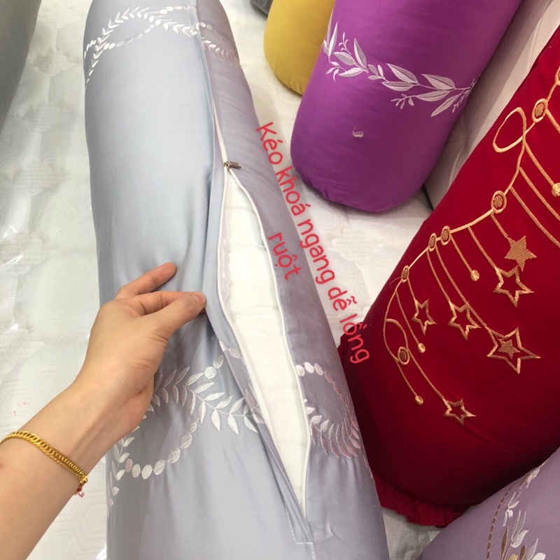 Vỏ Gối Ôm Satin Lụa Thêu Cao Cấp Kéo Khoá Ngang Mịn Mát Size 35 x 100