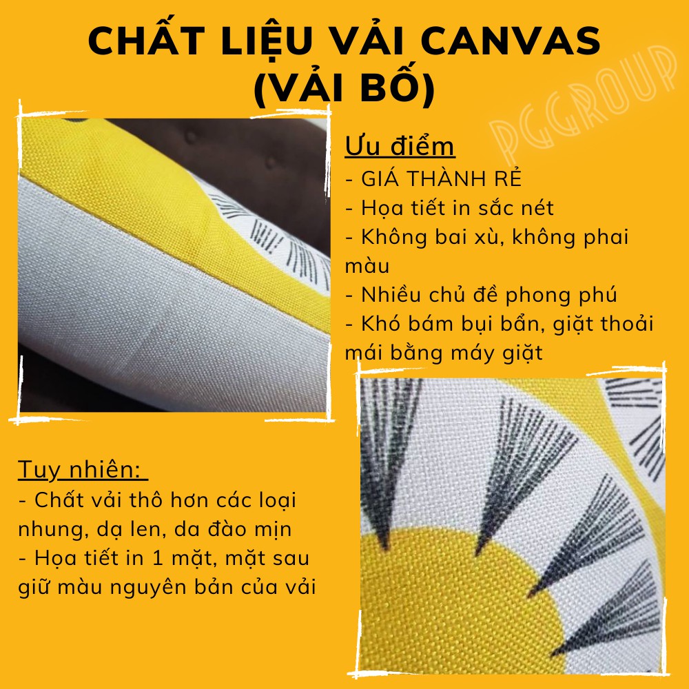- Chất liệu: Vỏ gối tựa may từ vải Canvas (Vải bố) dày dặn, họa tiết in 1 mặt. Quý khách lưu ý màu vỏ gối vuông chất liệu vải canvas là màu trắng be (pha kem), không phải màu trắng tinh (ảnh hiển thị có thể trắng tinh do lỗi bắt sáng "màu trắng" khi chụp ảnh).