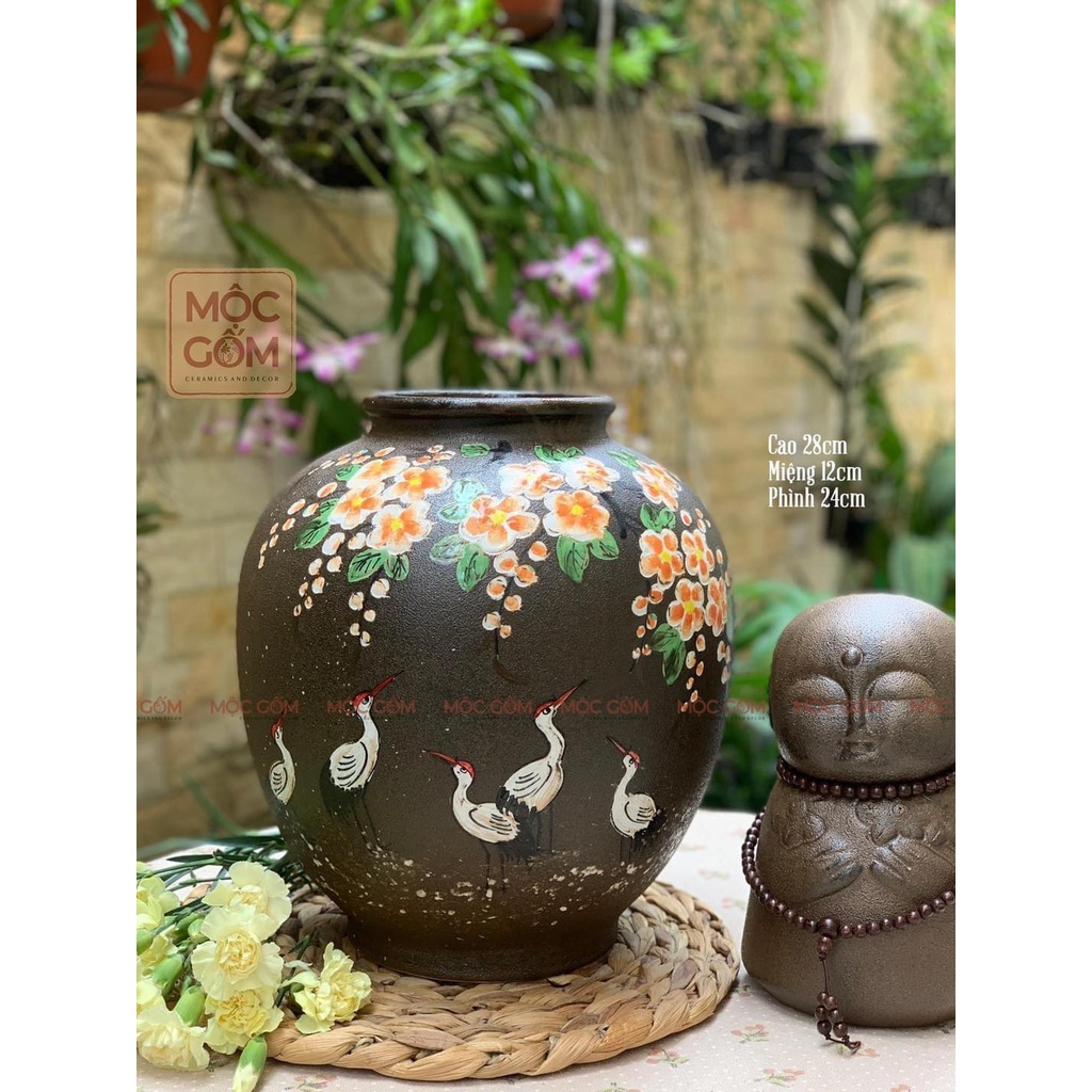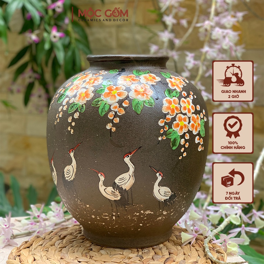 Nhà cửa & Đời sống > Trang trí nhà cửa > Bình trang trí || Vò gốm Bát Tràng trang trí họa tiết chim hạc dưới giàn hoa - Bình hoa gốm | Mộc Gốm MG98Còn hàng