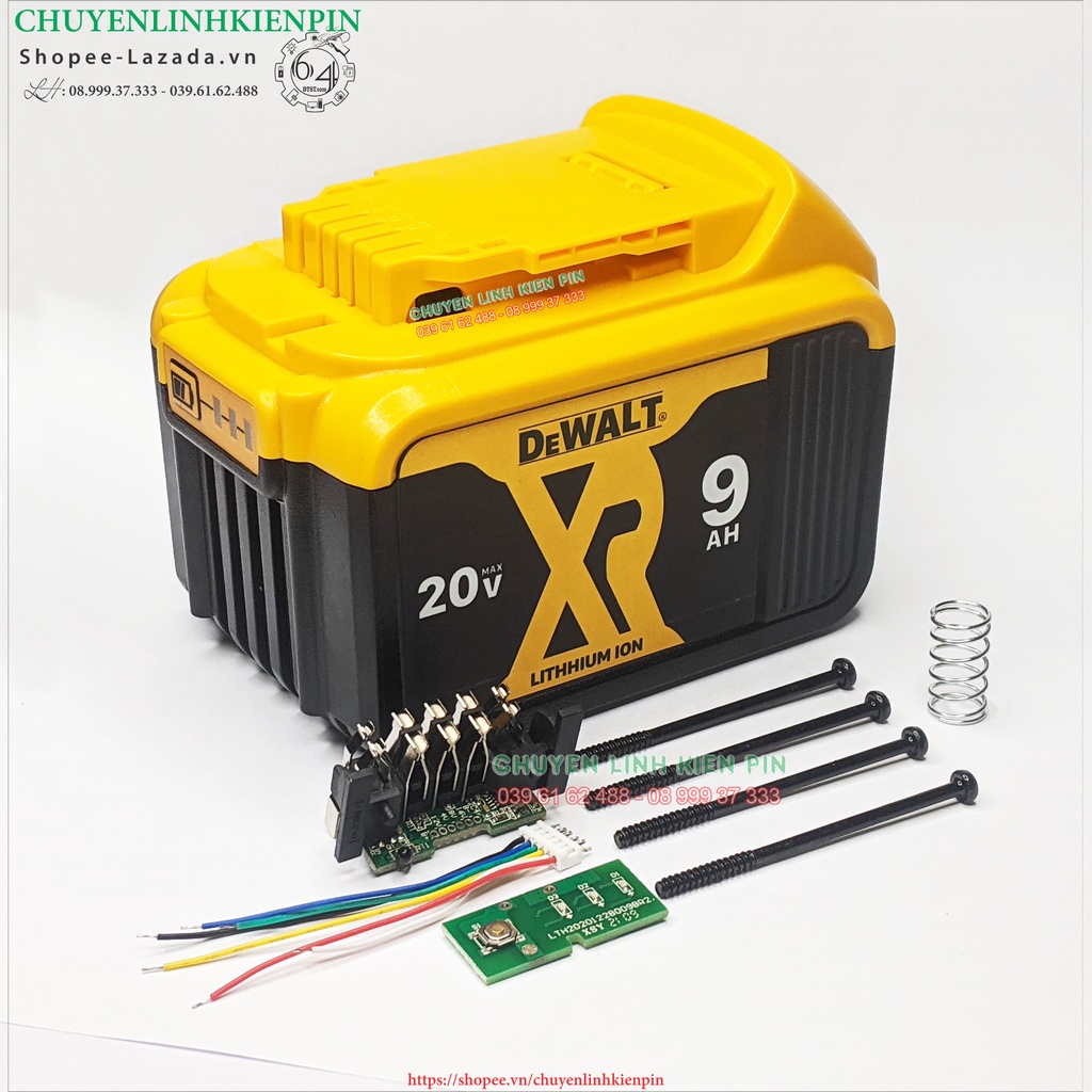 - Vỏ, mạch pin Dewalt 18V - 9Ah mạch có led báo pin và nhận sạc zin không có decal đế , loại để được 15 cell Li-ion 18650.