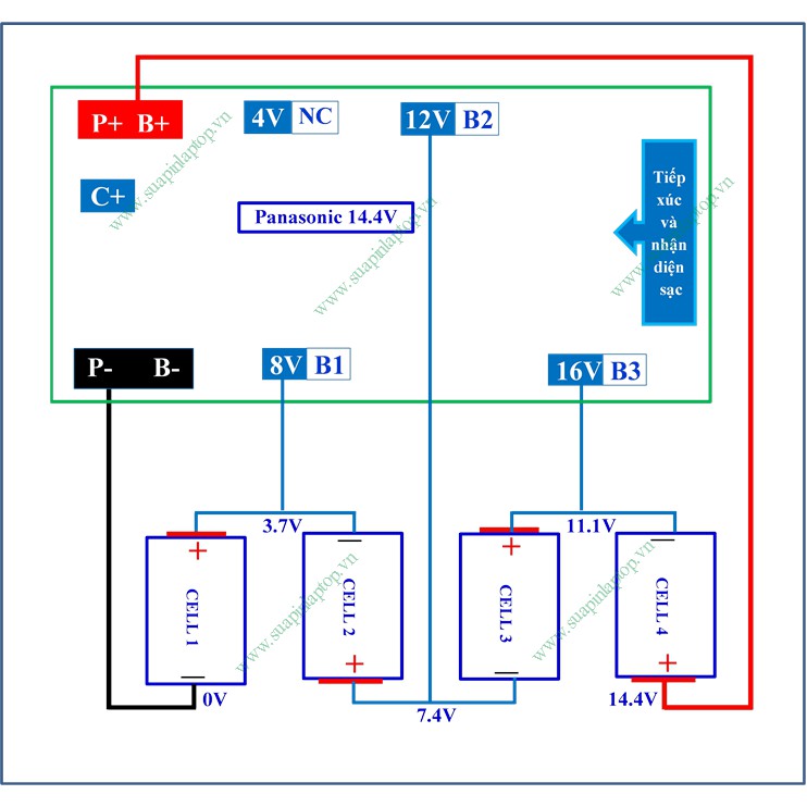 - Chú ý: Mạch Panasonic 4S 14.4V khi hàn dây phải bỏ trống chân 4V (NC - NonConnect).