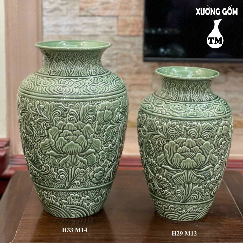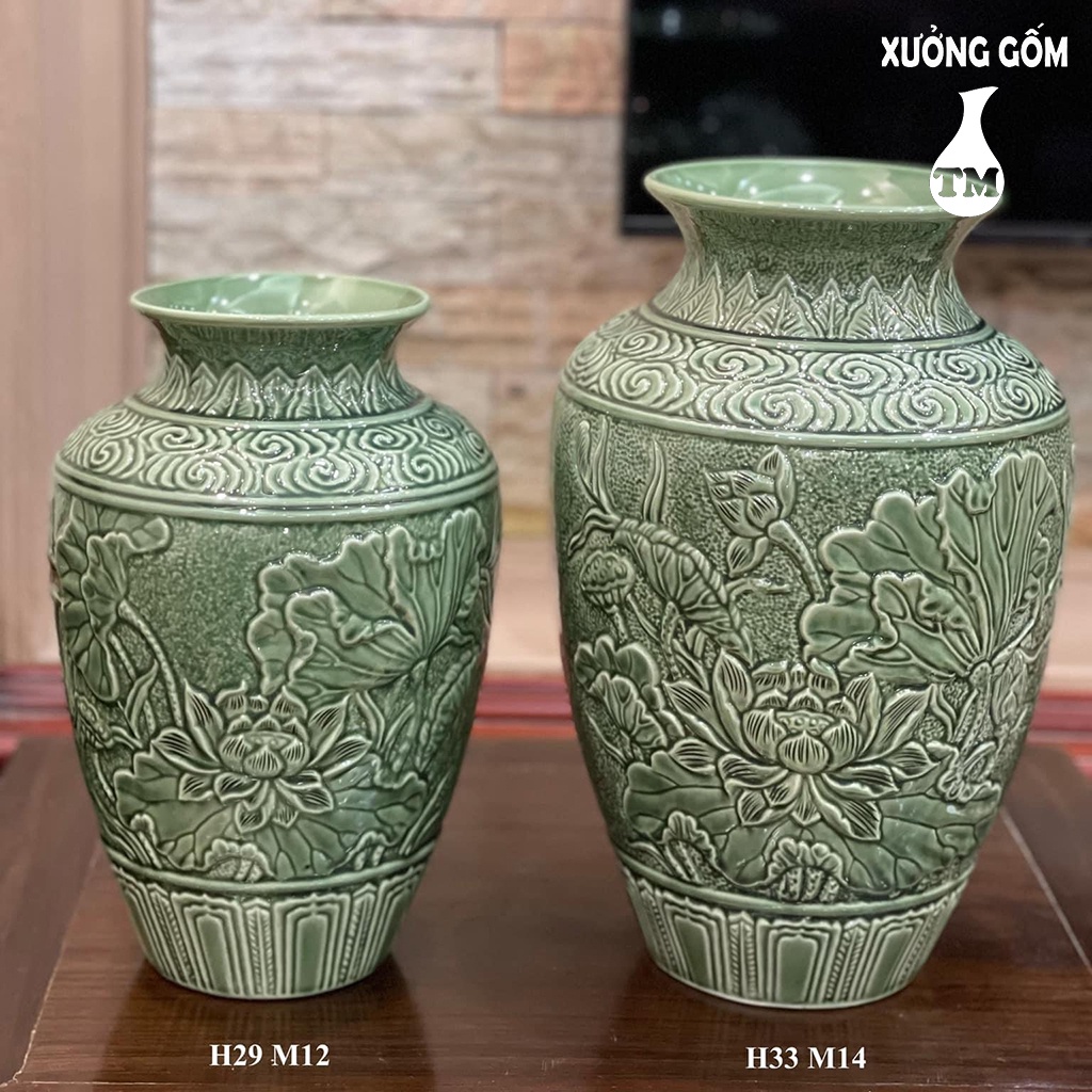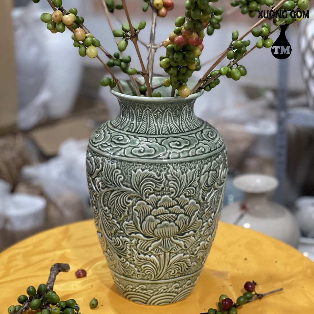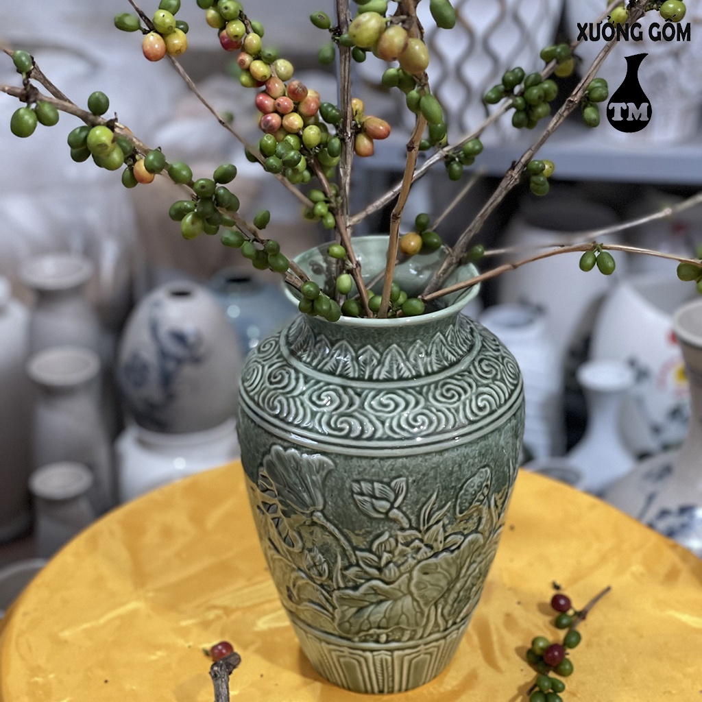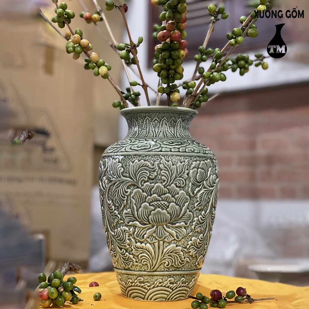 Giới thiệu Vò Phù Dung Khắc Nổi Men Ngọc Lưu Ly – Bình Cắm Hoa Cao Cấp Xưởng Gốm TM Bát Tràng