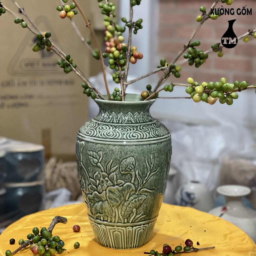 Vò Phù Dung Khắc Nổi Men Ngọc Lưu Ly – Bình Cắm Hoa Cao Cấp Xưởng Gốm TM Bát Tràng