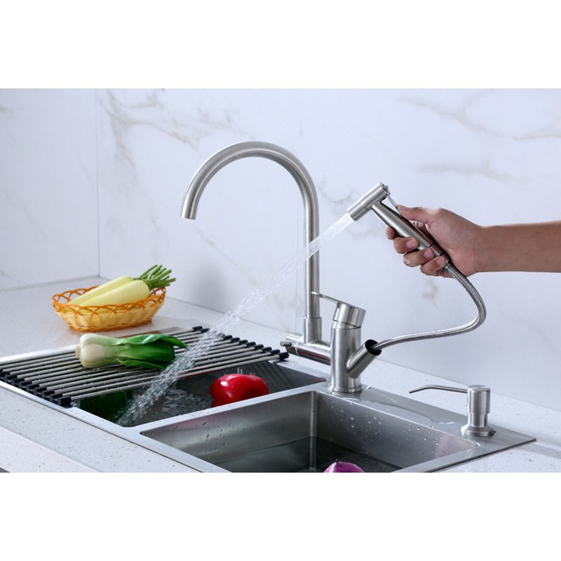 Vòi bếp nóng lạnh SUS304 (cổ tròn, kiêm xịt) - Hàng Cao cấp Bảo hành lâu dài (Kèm Đôi dây cấp)