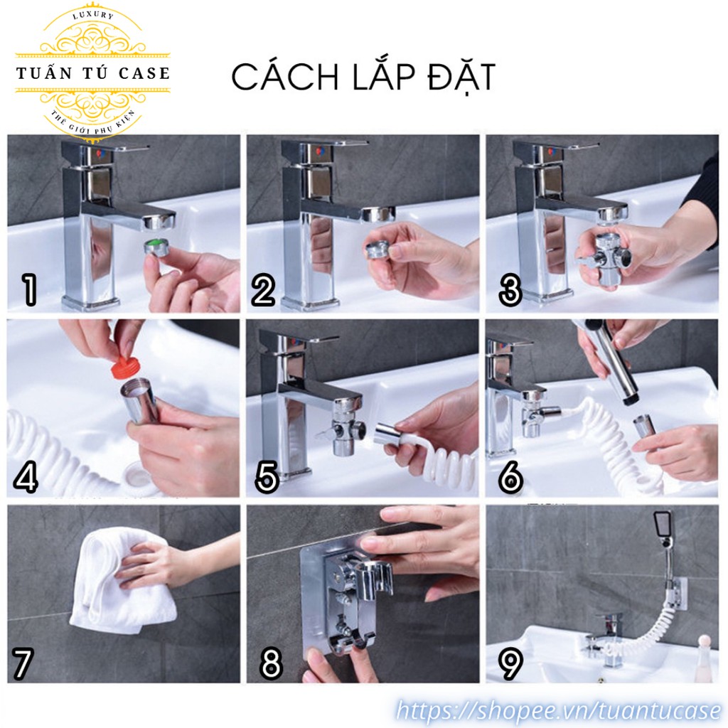 - Lắp đặt: sản phẩm có đầy đủ phụ kiện kèm theo, chỉ cần tháo đầu vòi đang dùng, lắp bộ chuyển đổi đi kèm, gắn vòi sen vào là dùng được ngay.