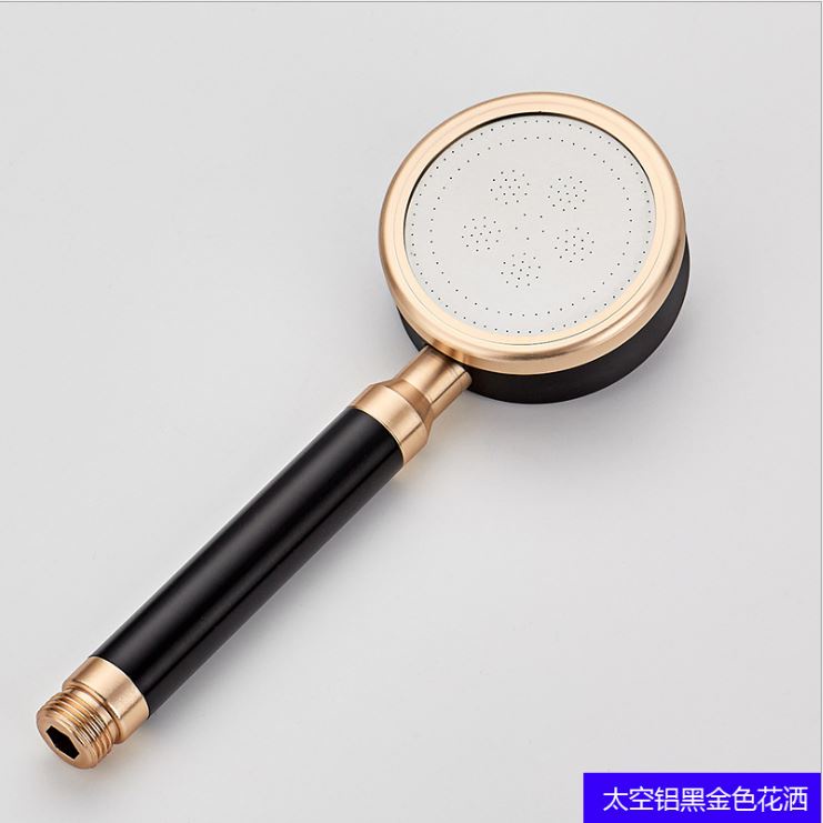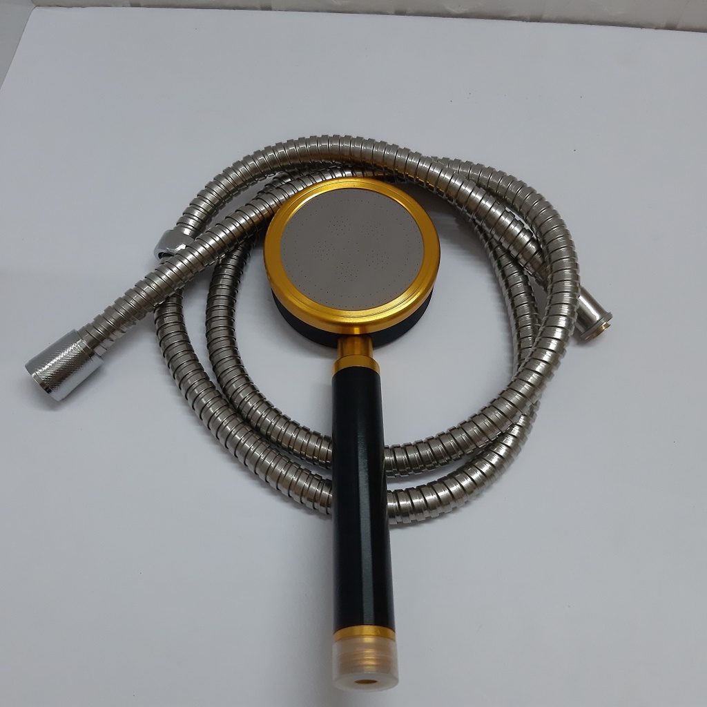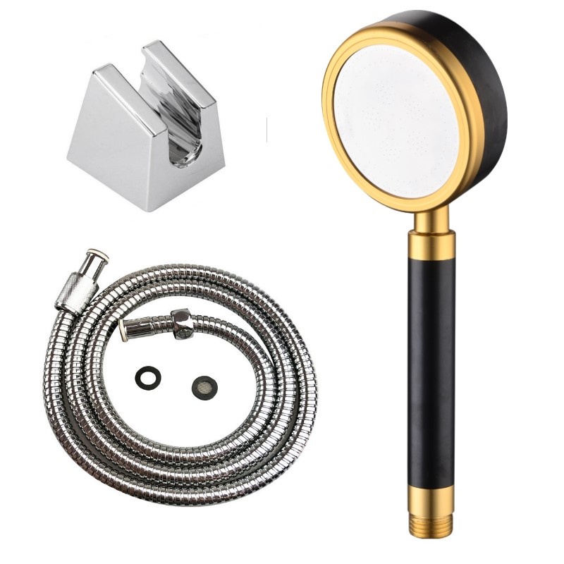 Bộ vòi hoa sen tắm tăng áp hợp kim nhôm màu vàng đen có hạt lọc kháng khuẩn đủ bộ tay sen+dây+gác cài -QM030