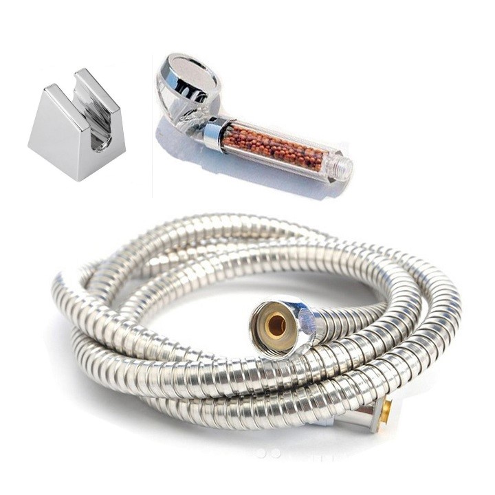 – Bộ sản phẩm gồm : 1 vòi hoa sen + 1 dây cấp nước Inox304 dài 1.5m chống xoắn + 1 giá đỡ vòi hoa sen