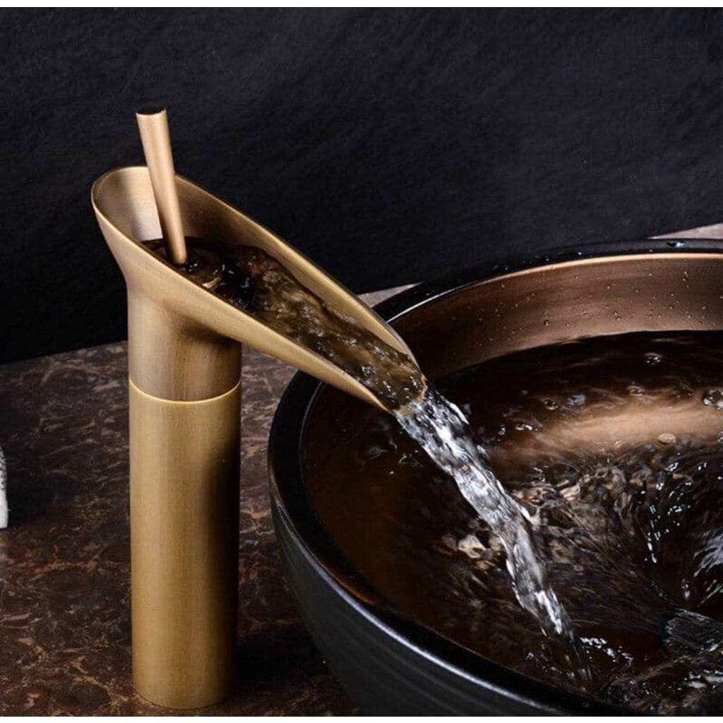 Vòi lavabo bằng đồng nóng lạnh, gật gù, bằng đồng thau, cổ điển. Ý tưởng khi thiết kế vòi nước bằng đồng thau lấy ý tưởng liên quan đến dòng nước trong thiên nhiên, những dòng suối nhỏ, có thác đổ được lồng ghép vào kiểu dáng model này, gạt nhẹ tay mở nước bạn sẽ thấy một dòng nước dâng trào lên và xuôi theo góc nghiên đổ xuống chậu rửa như là một dòng thác nhỏ. Nếu tông nội thất nhà bạn thiên về mộc mạc thiên nhiên hoặc bạn là người yêu thiên nhiên thì vòi nước này là một thiết bị để bạn lồng ghép thiên nhiên vào gian phòng nhà bạn.– Bộ trộn nước nóng lạnh gần gù, nhiệt độ nước, gạt tay gạt sang phía nước lạnh, nâng nhẹ tay gạt lên cho ra lượng nước đủ cần dùng sau đó gạt từ từ về phía nước nóng (bên trái) để điều chỉnh nhiệt độ nước nóng như mong muốn. Dùng cho lavabo, chậu rửa, lắp đặt nổi trên mặt bàn.