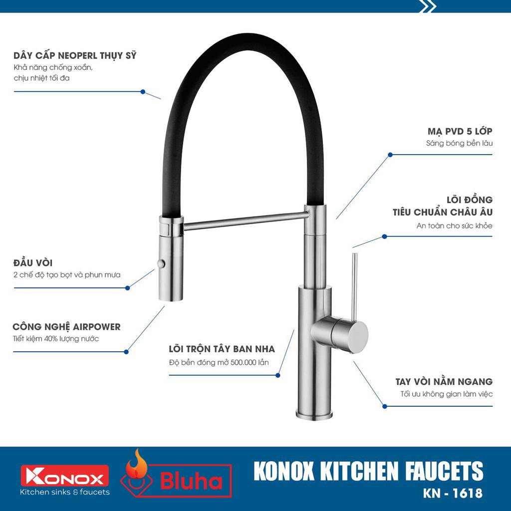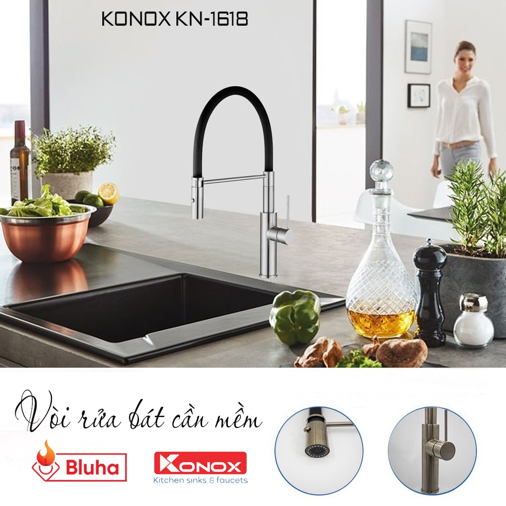 Giới thiệu Vòi rửa bát cần mềm KONOX KN-1618 hợp kim đồng tiêu chuẩn Châu Âu, 2 chế độ nước