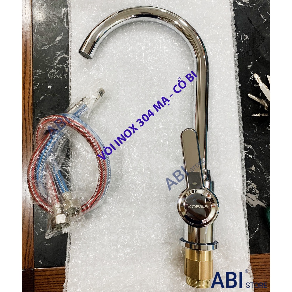 Vòi rửa bát inox 304 cổ bi hàng nặng đẹp, vòi chậu rửa chén nóng lạnh cần cứng kèm đôi dây cấp nước
