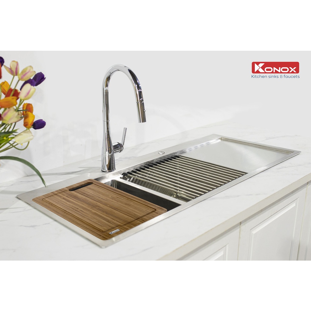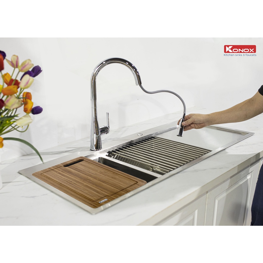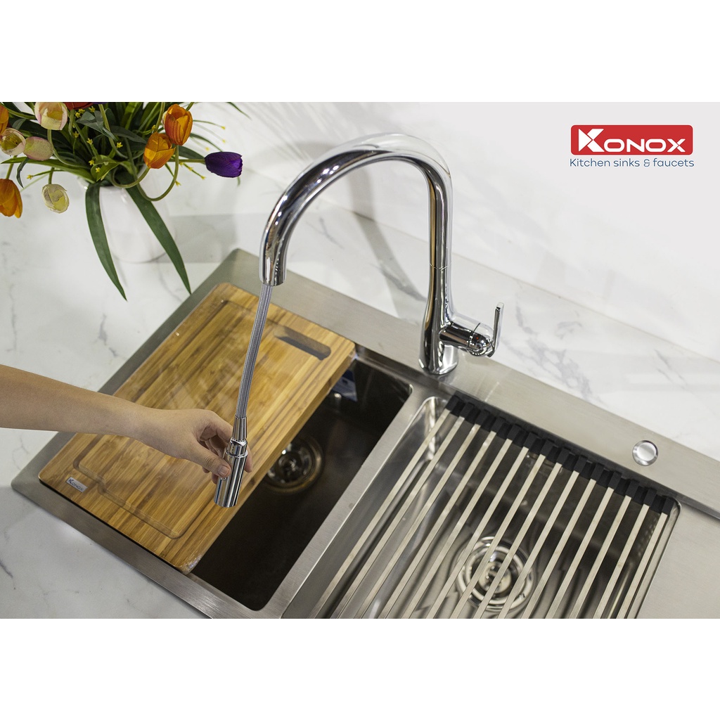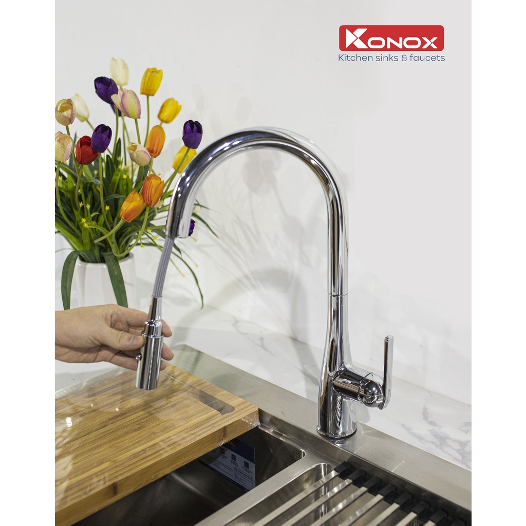 Nhà cửa & Đời sống > Dụng cụ & Thiết bị tiện ích > Chậu rửa & vòi nước || Vòi rửa bát rút dây KONOX Curva Chrome bề mặt xử lý mạ PVD Chrome 5 lớp, lõi hợp kim đồng 61% tiêu chuẩn Châu Âu CW617NCòn hàng
