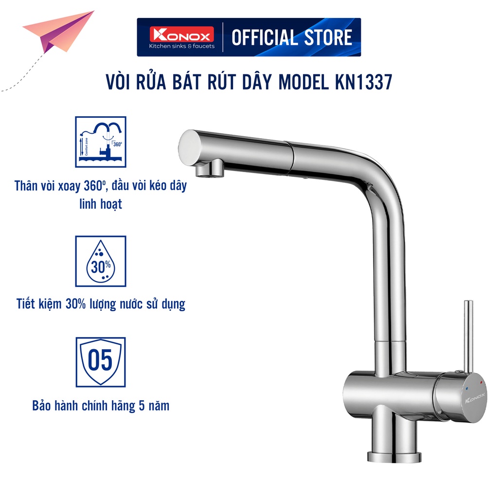 Nhà cửa & Đời sống > Dụng cụ & Thiết bị tiện ích > Chậu rửa & vòi nước || Vòi rửa bát rút dây KONOX KN1337 hợp kim đồng 61% tiêu chuẩn Châu Âu CW617N, bề mặt xử lý công nghệ PVD Chrome 5 lớpCòn hàng