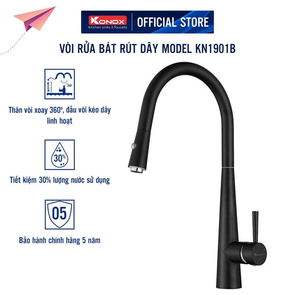 Nhà cửa & Đời sống > Dụng cụ & Thiết bị tiện ích > Chậu rửa & vòi nước || Vòi rửa bát rút dây KONOX KN1901B hợp kim đồng 61% tiêu chuẩn Châu Âu CW617N, bề mặt xử lý công nghệ Brushed NickelCòn hàng