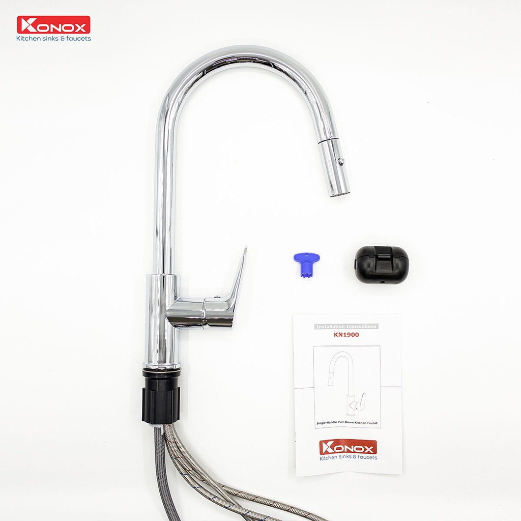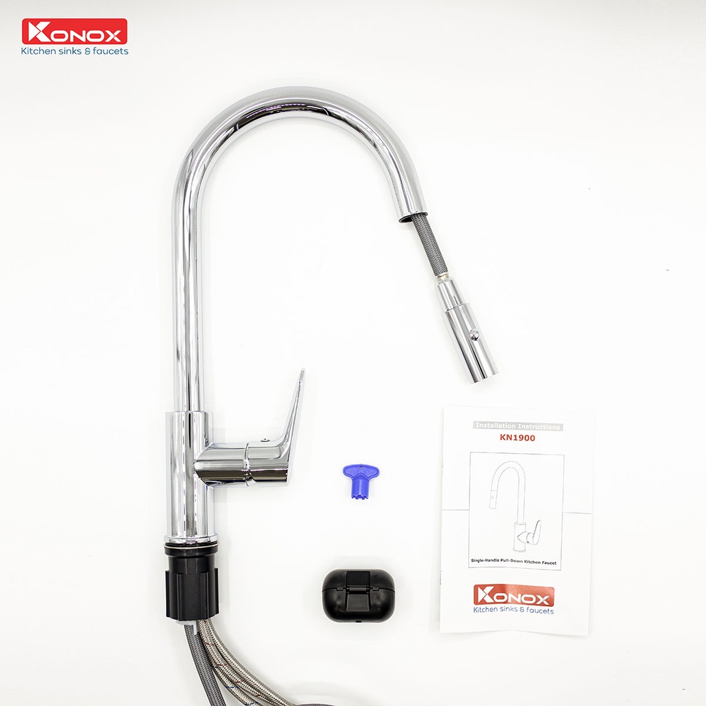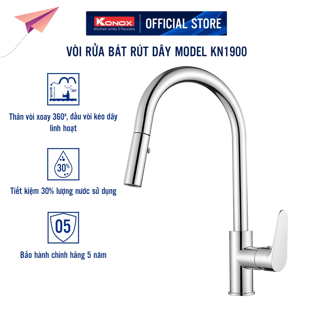 Nhà cửa & Đời sống > Dụng cụ & Thiết bị tiện ích > Chậu rửa & vòi nước || Vòi rửa bát rút dây KONOX KN1900 hợp kim đồng 61% tiêu chuẩn Châu Âu CW617N, bề mặt xử lý công nghệ PVD Chrome 5 lớpCòn hàng