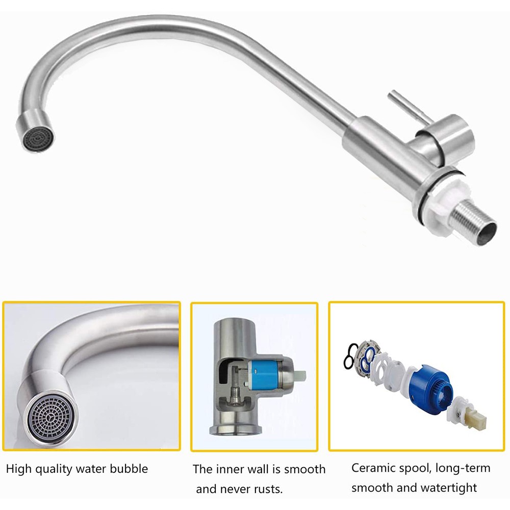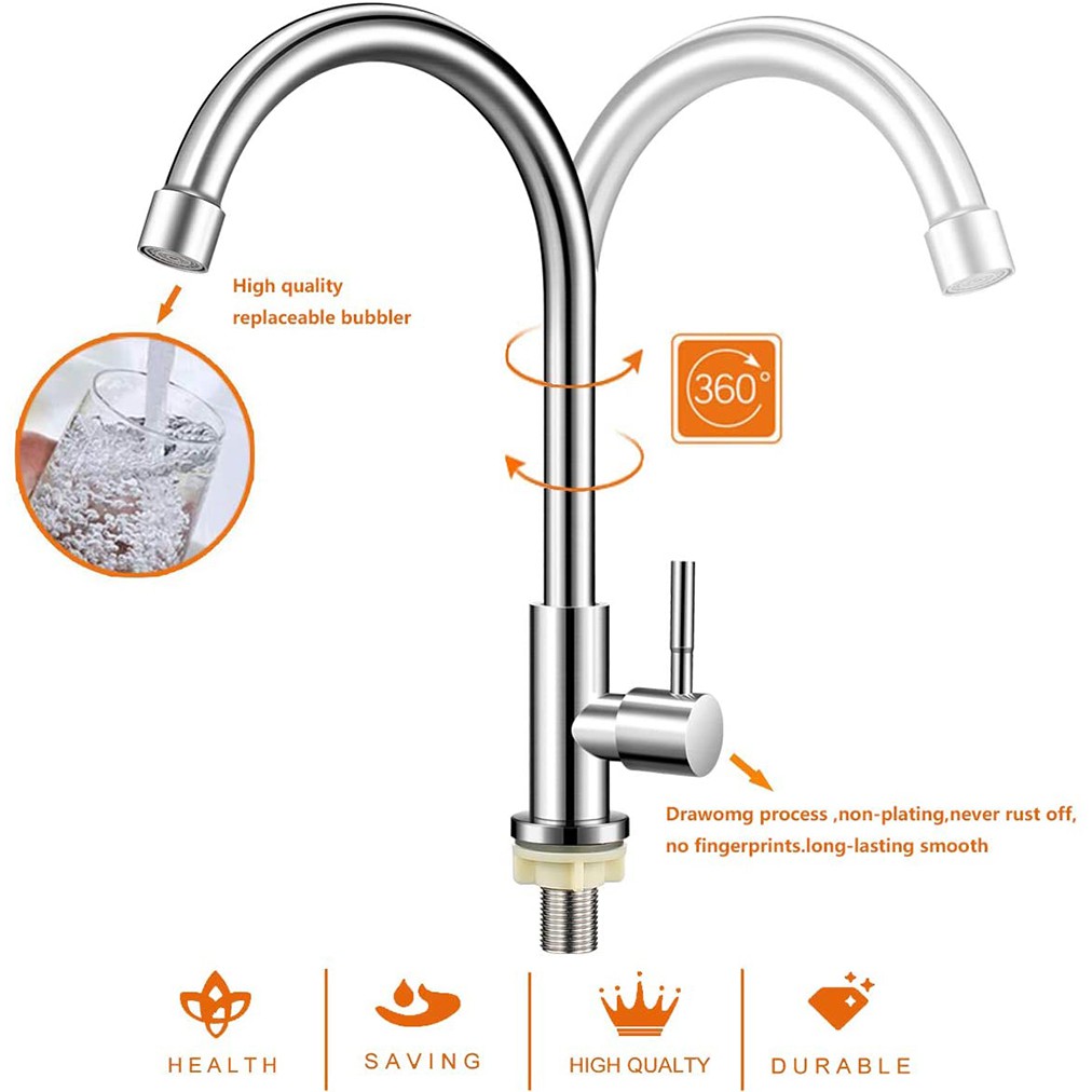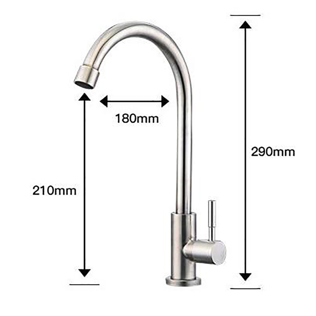 Vòi rửa chén lạnh có chất liệu inox SUS 304 tinh khiết, sáng bóng, bền bỉ.