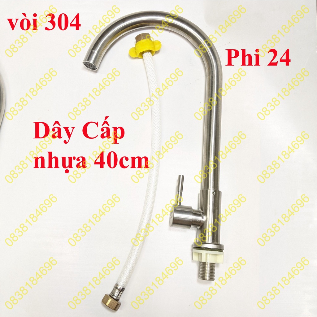 Vòi Rửa Chén Bát Lạnh phi 24mm inox SUS 304, xước mờ ống cong lớn lựa chọn Dây cấp nhựa,inox
