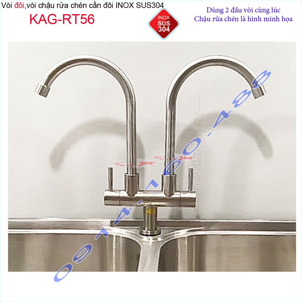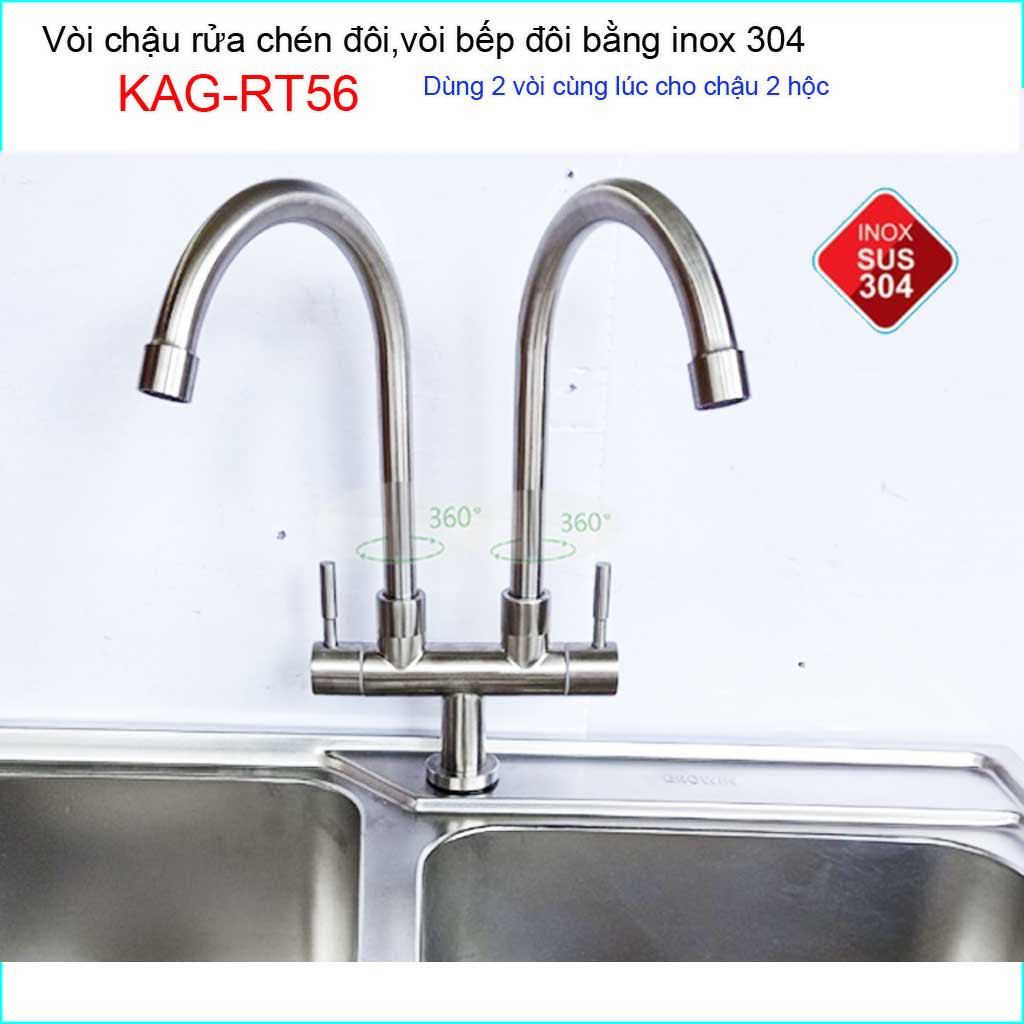 Vòi rửa chén đôi Inox SUS304 KAG-RT56, vòi chậu 2 hộc, vòi rửa chén bát lạnh 2 đầu vòi xả nước mạnh sử dụng tốt