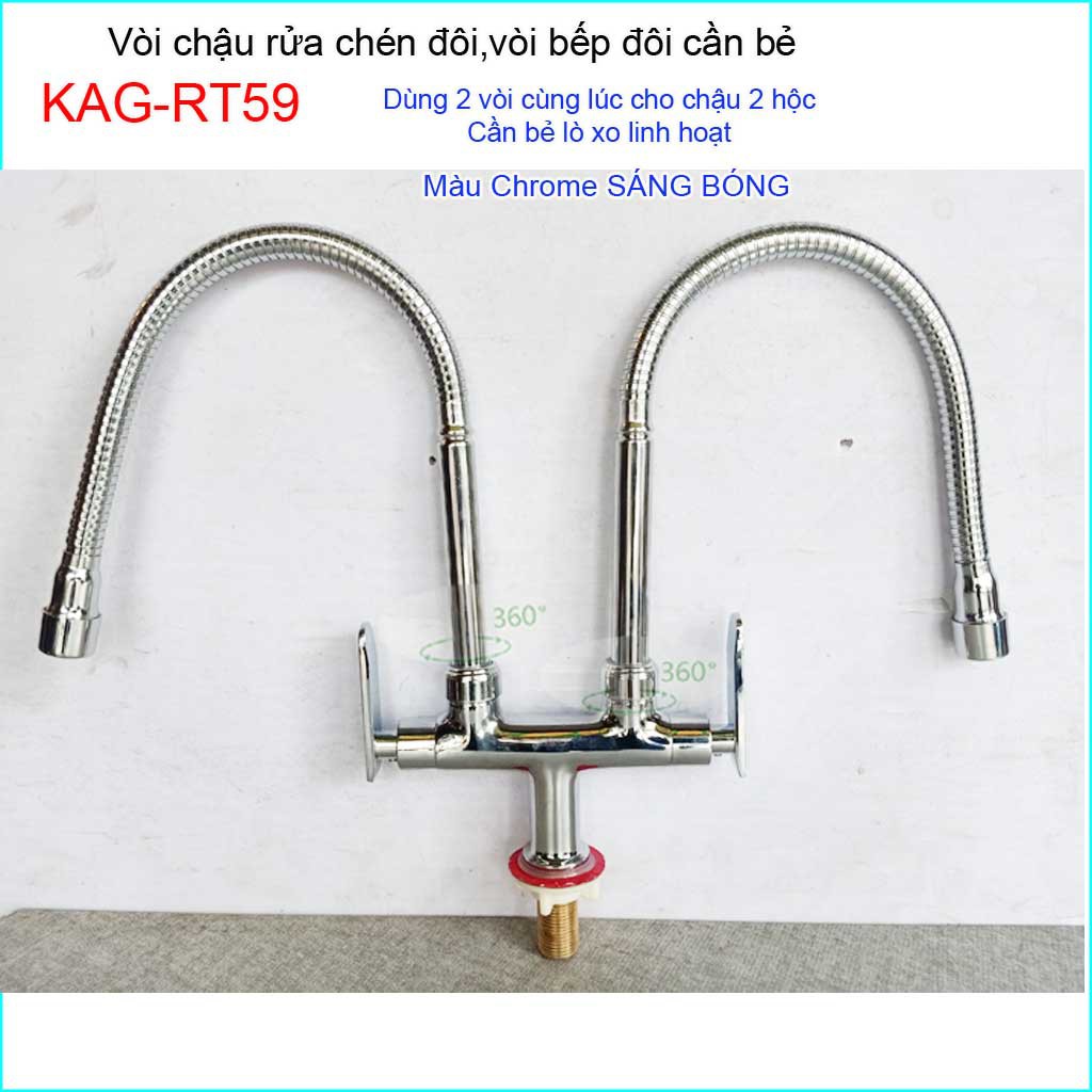 Vòi rửa chén đôi lò xo KAG-RT59, vòi rửa chén lạnh cần bẻ, vòi chậu 2 hộc, vòi rửa chén bát lò xo nước mạnh sử dụng tốtVòi bếp đôi KAG-RT59A có 2 đầu vòi nước chuyên dùng cho chậu chén 2 hộc ( chậu chén đôi), cần vòi mềm có thể bẻ, uốn tiện sử dụng
