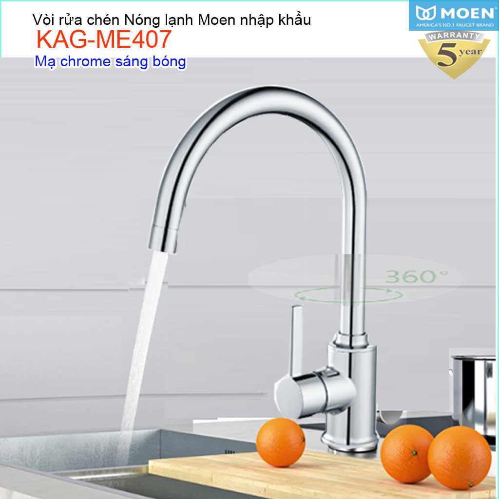 Vòi rửa chén nóng lạnh Moen, vòi rửa chén bát KAG-ME407 có thể xoay 180 độ nên dùng cho chậu rửa chén bát 1 hộc, chậu rửa chén bát 2 hộc, chậu rửa chén bát 3 hộc.