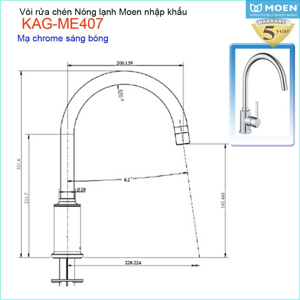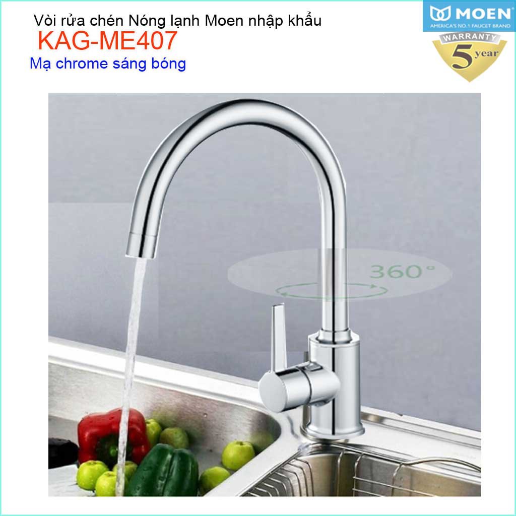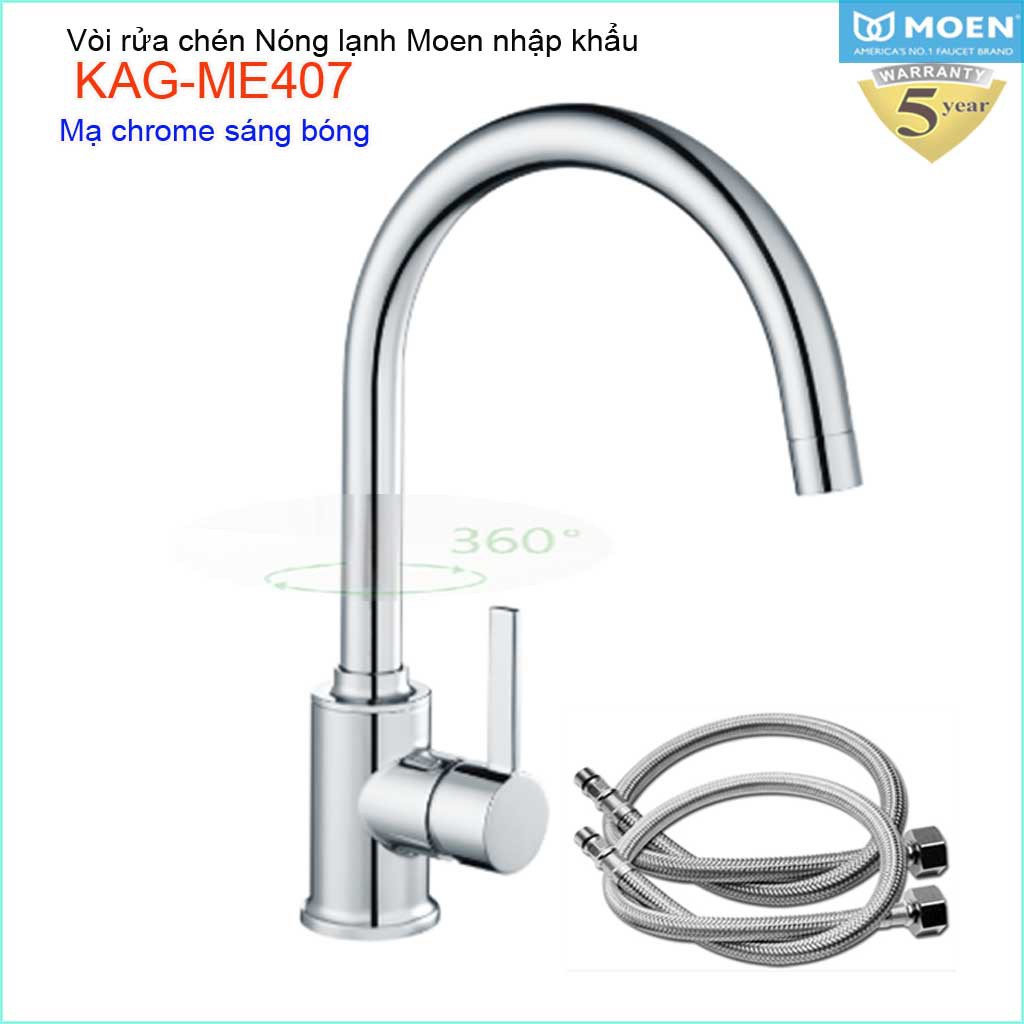 Vòi rửa chén nóng lạnh Moen, vòi rửa chén bát KAG-ME407Chất liệu: Vòi rửa chén nóng lạnh Moen, vòi rửa chén bát KAG-ME407 nhập khẩu nguyên chiếc 100% từ nhá máy sản xuất của tập đoàn MOEN, thương hiệu hàng đầu của American, Vòi MOEN đạt chuẩn chất lượng cao đáp ứng mọi yêu cầu của các khách hàng trên toàn thế gới.