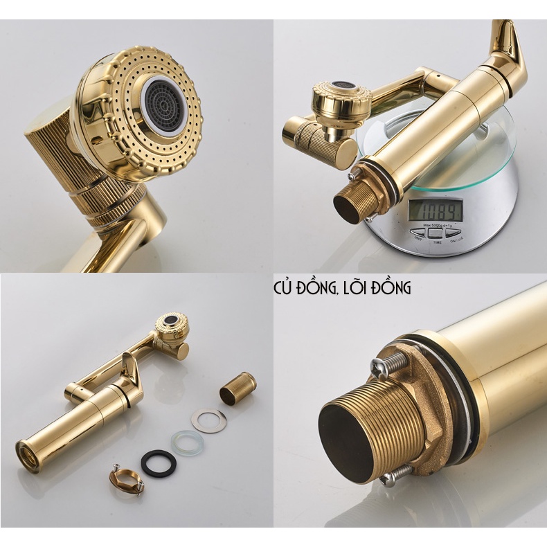 Vòi rửa mặt Lavabo cổ xoay 720 độ đa chiều, củ đồng, thân cao, mạ vàng, điều chỉnh nhiều chế độ tia nước Minh HouseMô Tả Sản Phẩm:
