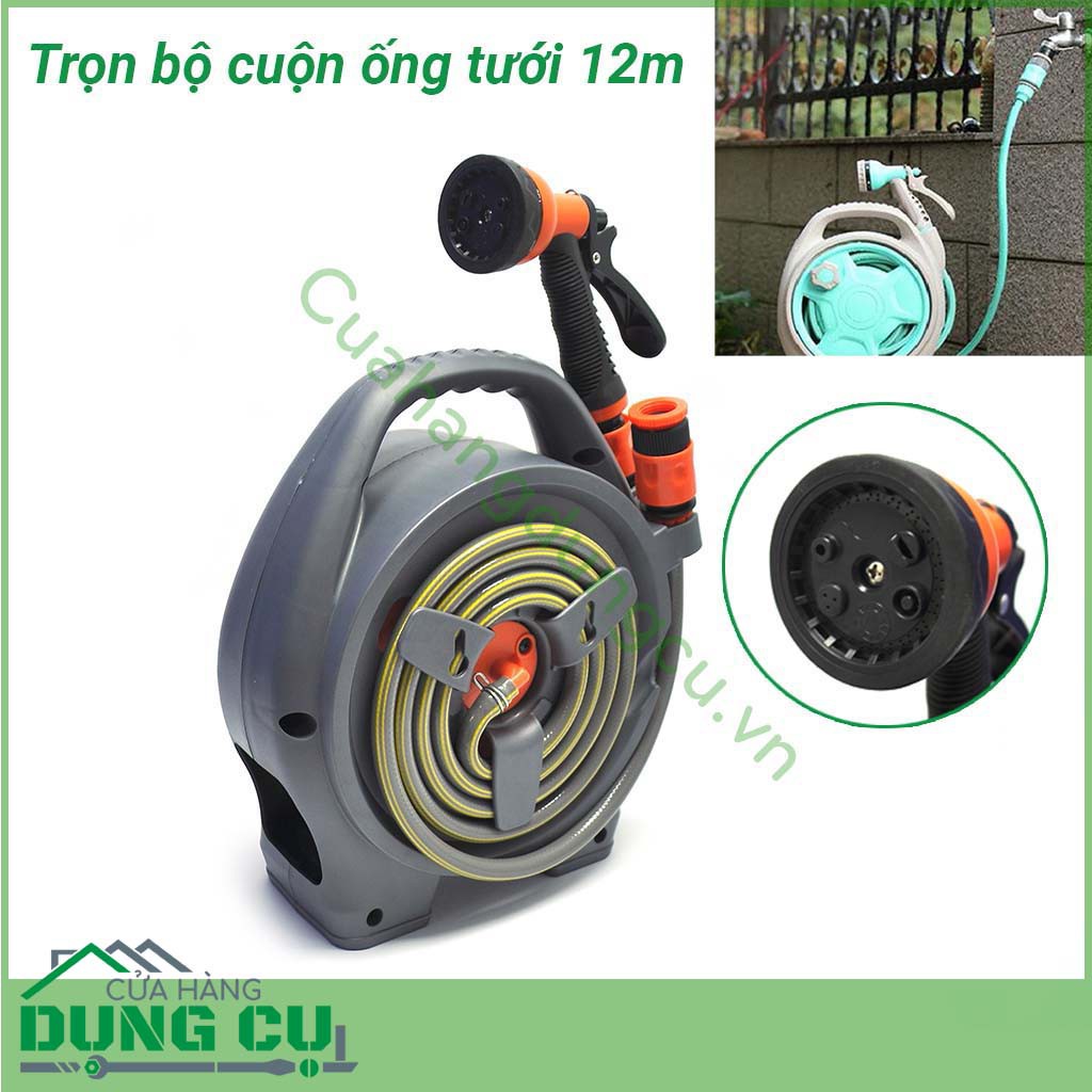 Bộ vòi rửa xe, tưới cây thu cuộn dây ống dài 12m Ống nước siêu bền, không gập, không xoắn, chịu áp lực cao