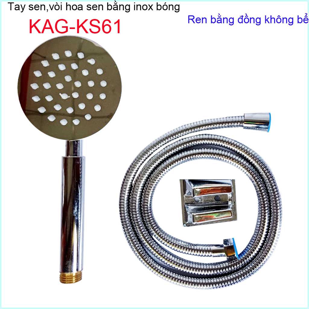 Vòi sen tắm Inox 304, vòi sen nóng lạnh, vòi hoa sen KAG-KS61Chất liệu: Vòi sen tắm Inox 304, vòi sen nóng lạnh, vòi hoa sen KAG-KS61 sản xuất bằng Inox 304 sáng bóng, sử dụng bền bỉ theo thời gian, dây sen mềm- nhuyễn chịu áp cao, dễ sử dụng.