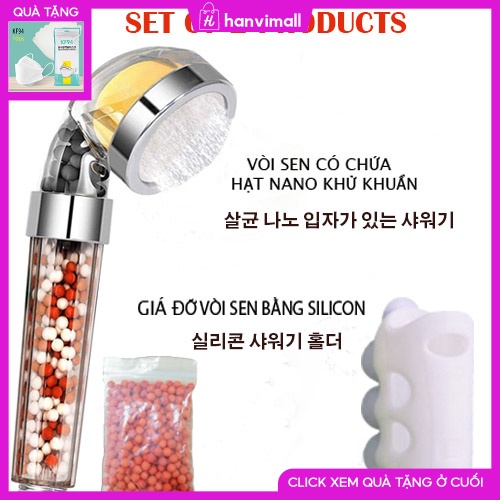 - Sản phẩm chỉ có 1 đầu vòi sen tăng áp loại vừa tay sen tròn có hạt lọc nano và được tặng kèm 2 giá đỡ vòi sen