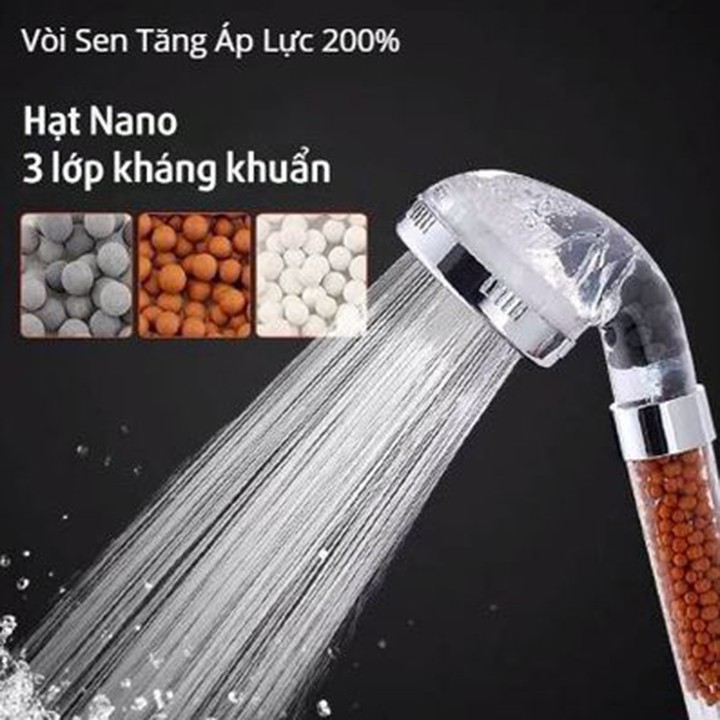 Vòi tắm hoa sen tăng áp Nano công nghệ Nhật Bản (Tay sen - Dây nối)Vòi hoa sen tăng áp Nano công nghệ Nhật Bản - Vòi tắm tăng áp làm bằng chất liệu inox không gỉ bền chắc + Nhựa ABS cao cấp chịu lực va đập, chắc chắn hạn chế vỡ ngay cả khi chịu lực tác động mạnh. Ứng dụng công nghệ Nano nhờ các hạt Nano (anion) giúp thanh lọc nước, diệt vi khuẩn, khử độc, làm sạch da, đẹp da.. Tạo lưu luồng nước mạnh, ngay cả khi nhà bạn ở tầng thứ 30 hoặc nước nhà bạn trong tình trạng ít, chảy nhỏ. Massage tóc, kính thích da đầu cho bạn mái tóc luôn mềm mại và mượt mà. Tạo cảm giác thư thái, thoải mái cho người tắm. Tiết kiệm nước 1 cách tối đa Kiểu dáng sang trọng, đẹp mắt phù hợp với mọi không gian phòng tắm.