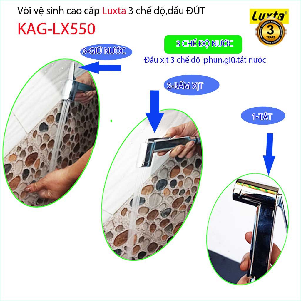 Vòi xịt nhà vệ sinh cao cấp Luxta, vòi xịt Đầu đút có chức năng giữ nước KAG-LX550 có thể xoay tay gạt để giữ nước cố định, không cần phải nhấn tay gạt trong suốt quá trình xịt rửa , tia nước mạnh tập trung, xịt rửa dễ dàng cặn bám bẩn cho nhà vệ sinh luôn sạch sẽ.