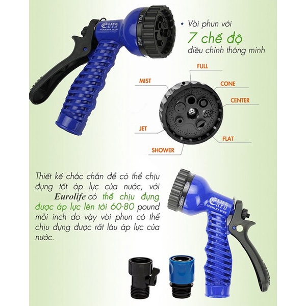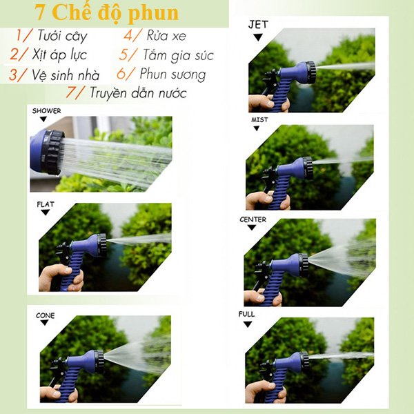 Đặc điểm nổi bật của vòi xịt nước giãn nở đa năng tưới cây, rửa xe:– Sản phẩm có cấu tạo đặc biệt với khả năng giãn nở gấp 3 lần cùng 7 chế độ phun.