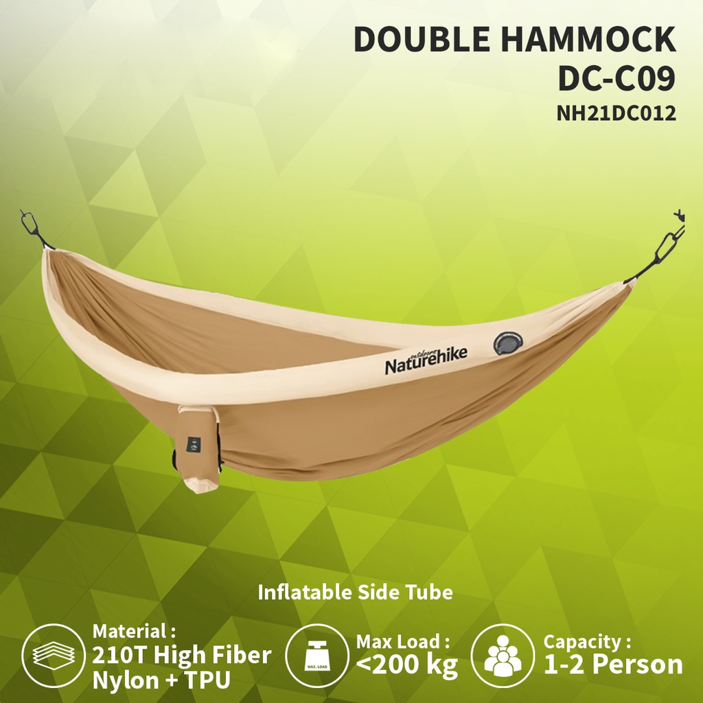 Võng dã ngoại Naturehike NH21DC012 chất liệu Nylon 210T chịu tải <200kg. Với ống bơm hơi TPU trên mép võng có thể chứa đầy không khí để tạo cảm giác thoải mái hơn và giúp võng ổn định hơn (chống lật)