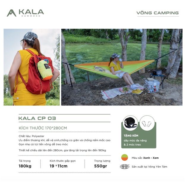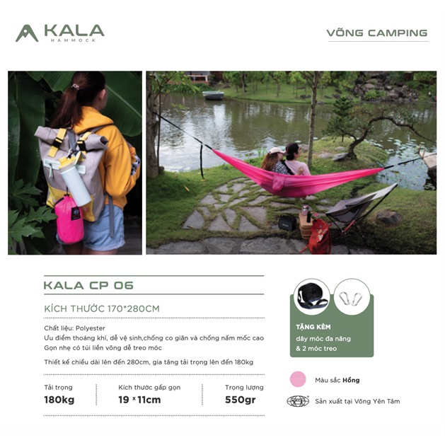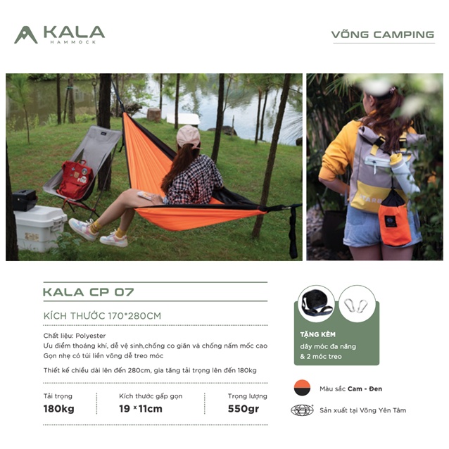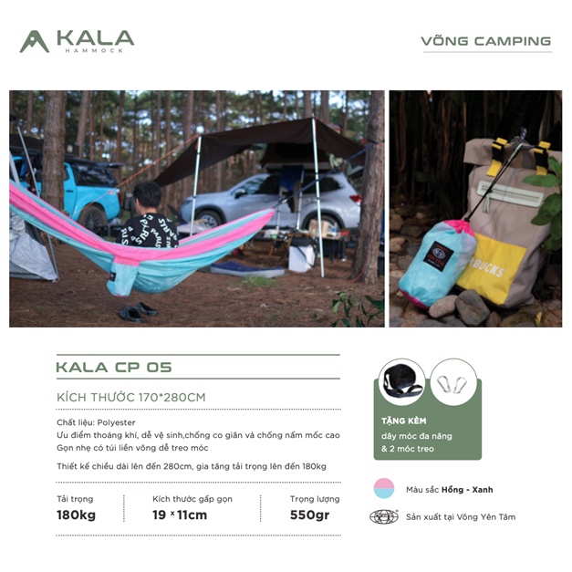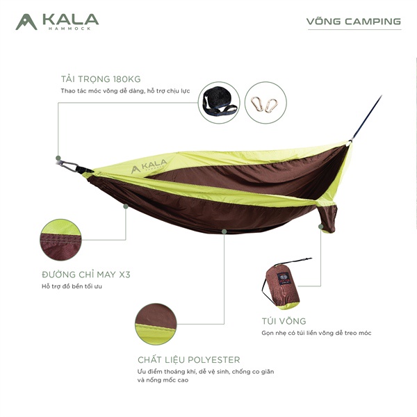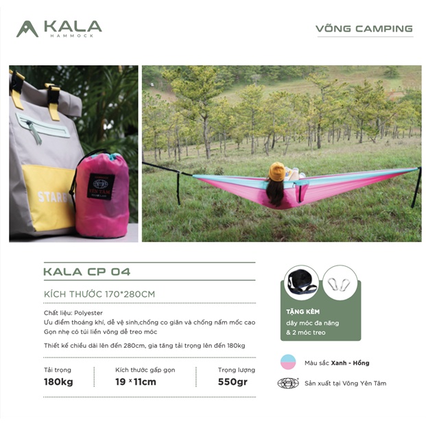 Võng dã ngoại siêu nhẹ KALA Hammock với ưu điểm thoáng khí, dễ dàng vệ sinh, chống co dãn và chống nấm mốc cao. Gọn nhẹ có túi liền võng dễ treo móc.