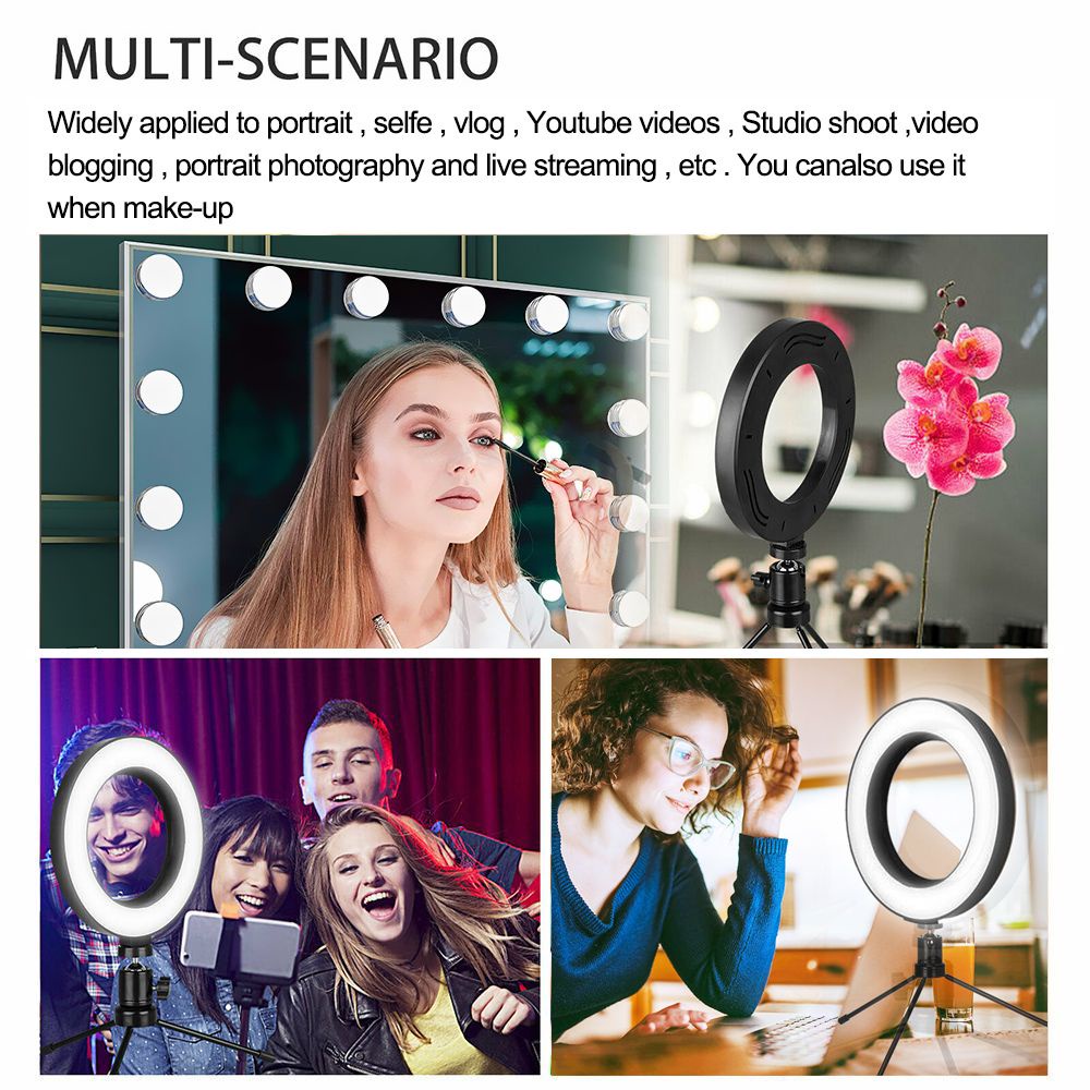 10 inch Ring Light:Dimmable and adjustable,you can adjust lighting effect from 10%-100%. Selfie ring light makes you be more engaging and charming.